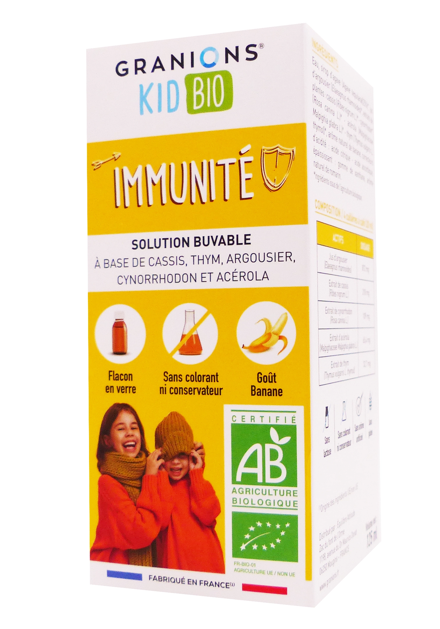 Granions Kid Bio Immunité 125 ml est un sirop aux plantes bio, goût banane, formulé pour contribuer à renforcer les défenses naturelles et la résistance de l’organisme des enfants, grâce à une combinaison de cynorrhodon, argousier, cassis, acérola et thym, riches en vitamine C et antioxydants. Sa formulation sans sucres ajoutés, sans colorant ni conservateur artificiel, et son goût agréable en font un complément facile à intégrer dans la routine des enfants, surtout en période de vulnérabilité immunitaire. Utilisé de manière ciblée et ponctuelle, associé à une bonne hygiène de vie, il peut aider à traverser plus sereinement les périodes de rentrée, d’hiver et de réunions en collectivité.