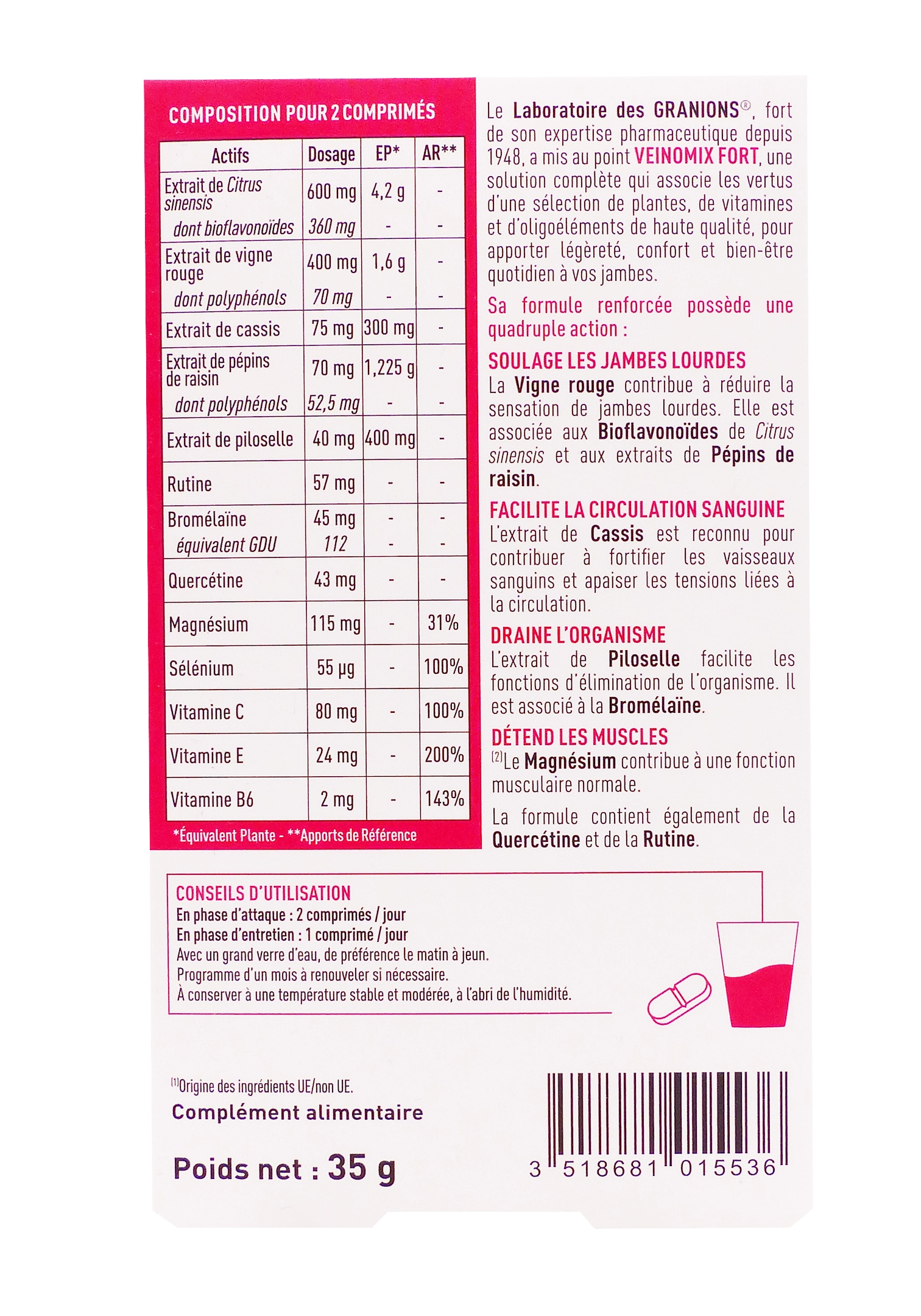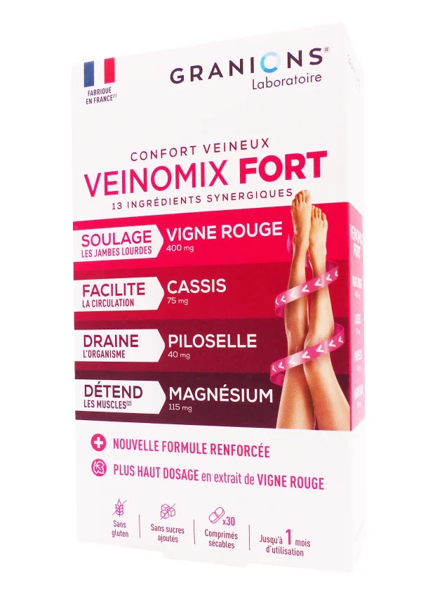 Veinomix Fort Granions 30 comprimés est un complément alimentaire 4-en-1 conçu pour soulager les jambes lourdes, améliorer la circulation veineuse, détendre les muscles et drainer l’organisme. Sa formule riche associe extraits végétaux concentrés (oranger doux bioflavonoïdes, vigne rouge polyphénols, piloselle, cassis, pépins de raisin) à des minéraux (magnésium) et vitamines (C, E, B6, sélénium) pour un soutien global du confort veineux. Boîte de 30 comprimés pour 1 mois, il cible particulièrement la rétention d’eau, la fatigue musculaire et les sensations de jambes fatiguées liées à la station debout ou à la chaleur.