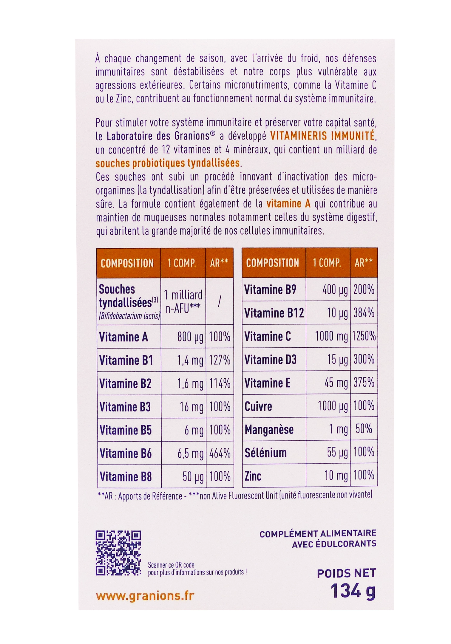 Réduit la fatigue (vitamines B, C) et favorise le métabolisme énergétique ; vitamines D et sélénium pour une immunité optimale.