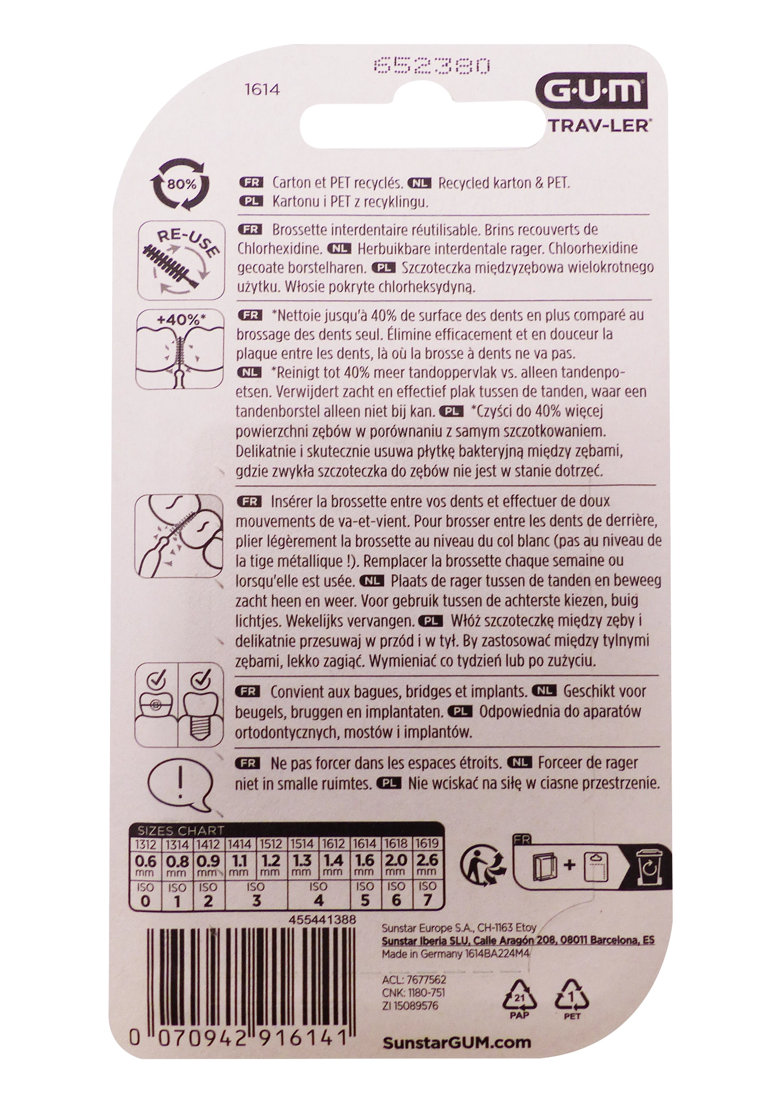 Gum Trav-Ler 4 brossettes interdentaires 1.6 mm bleues sont des brossettes cylindriques conçues pour nettoyer les espaces interdentaires larges (diamètre 1,6 mm), particulièrement adaptées aux molaires postérieures, implants, bridges ou dents espacées chez l’adulte. Leur manche ergonomique flexible avec grip antidérapant et tête coudable à 90° facilite l’accès aux zones difficiles, tandis que les brins triangulaires en nylon imprégnés de chlorhexidine éliminent 25% de plaque dentaire supplémentaire et préviennent la prolifération bactérienne entre les utilisations.