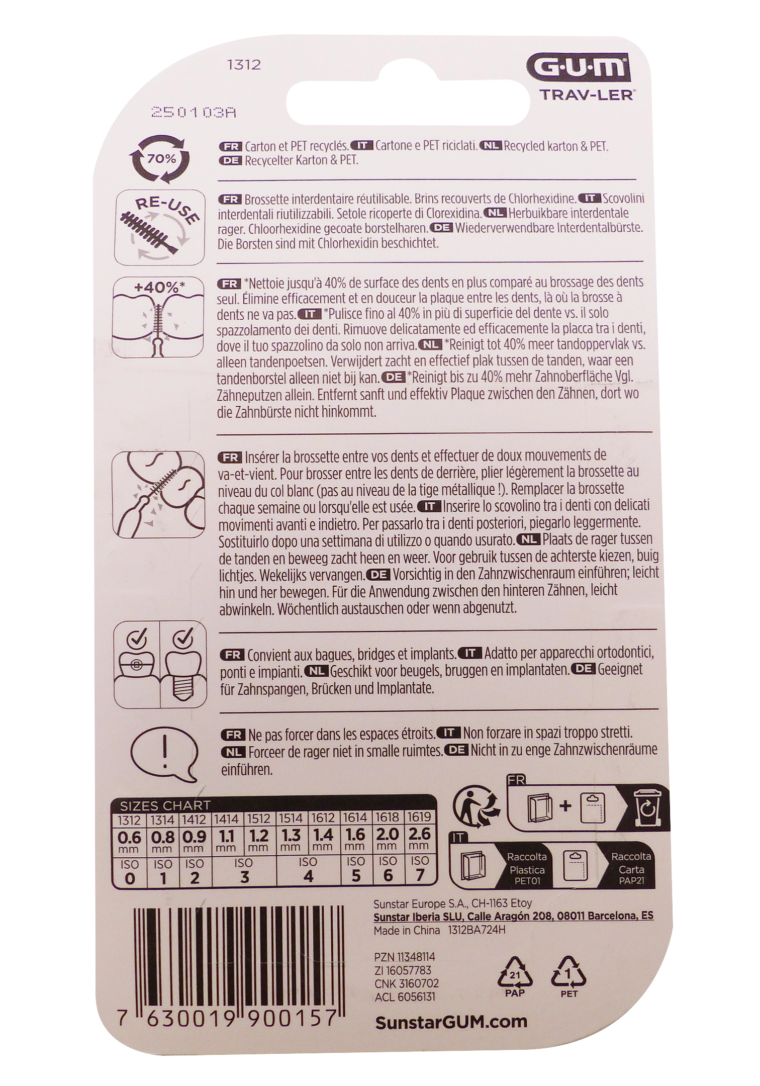 Atouts de Gum Trav-Ler 6 brossettes interdentaires 0.6 mm :