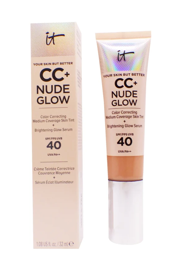 It Cosmetics CC+ Nude Glow SPF 40 teinte Medium est bien plus qu’une simple crème teintée. Conçu par le laboratoire IT Cosmetics, ce soin hybride associe les performances d’un fond de teint correcteur, l’efficacité d’une crème hydratante et la protection d’un écran solaire SPF 40. Il unifie le teint, floute les imperfections et apporte un éclat naturel sans effet masque, tout en respectant la peau.