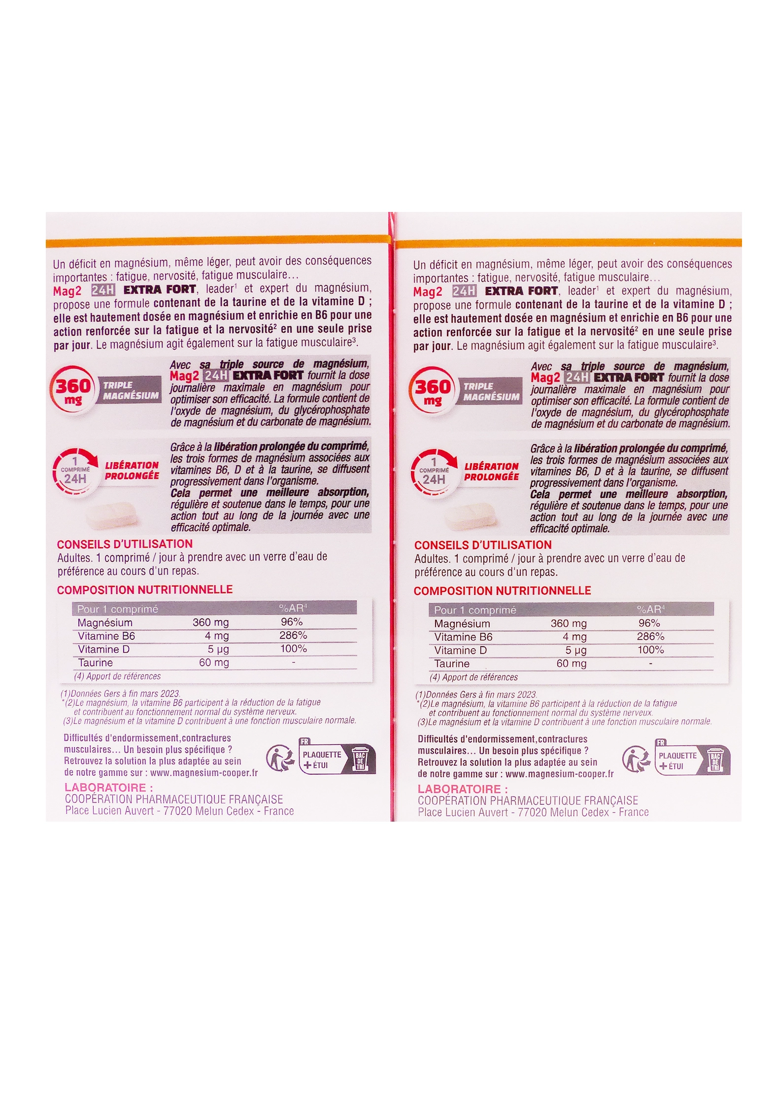 MAG 2 Magnésium 360 mg 24h Extra Fort du laboratoire Cooper est un complément alimentaire destiné à compenser les déficits en magnésium chez l’adulte. Chaque comprimé à libération prolongée offre un apport constant en magnésium sur une durée de 24h, pour une action continue tout au long de la journée. Ce format lot de 2×45 comprimés permet une cure complète de plusieurs semaines, pratique et économique.