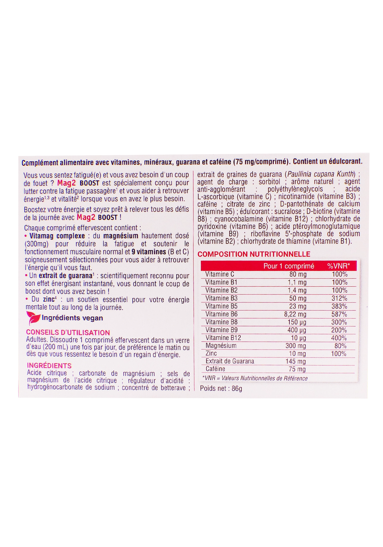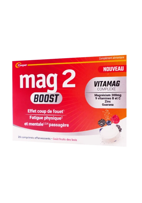 Mag2 Boost 20 comprimés effervescents est un complément alimentaire sous forme de comprimés effervescents, spécialement formulé pour aider à réduire la fatigue passagère et soutenir l’énergie physique et mentale. Sa formule associe du magnésium à des vitamines du groupe B, contribuant au fonctionnement normal du système nerveux et musculaire. Grâce à son format effervescent, il se dissout rapidement dans l’eau pour une prise agréable et une assimilation optimale, idéale en période de surmenage, d’activité intense ou de baisse de tonus.