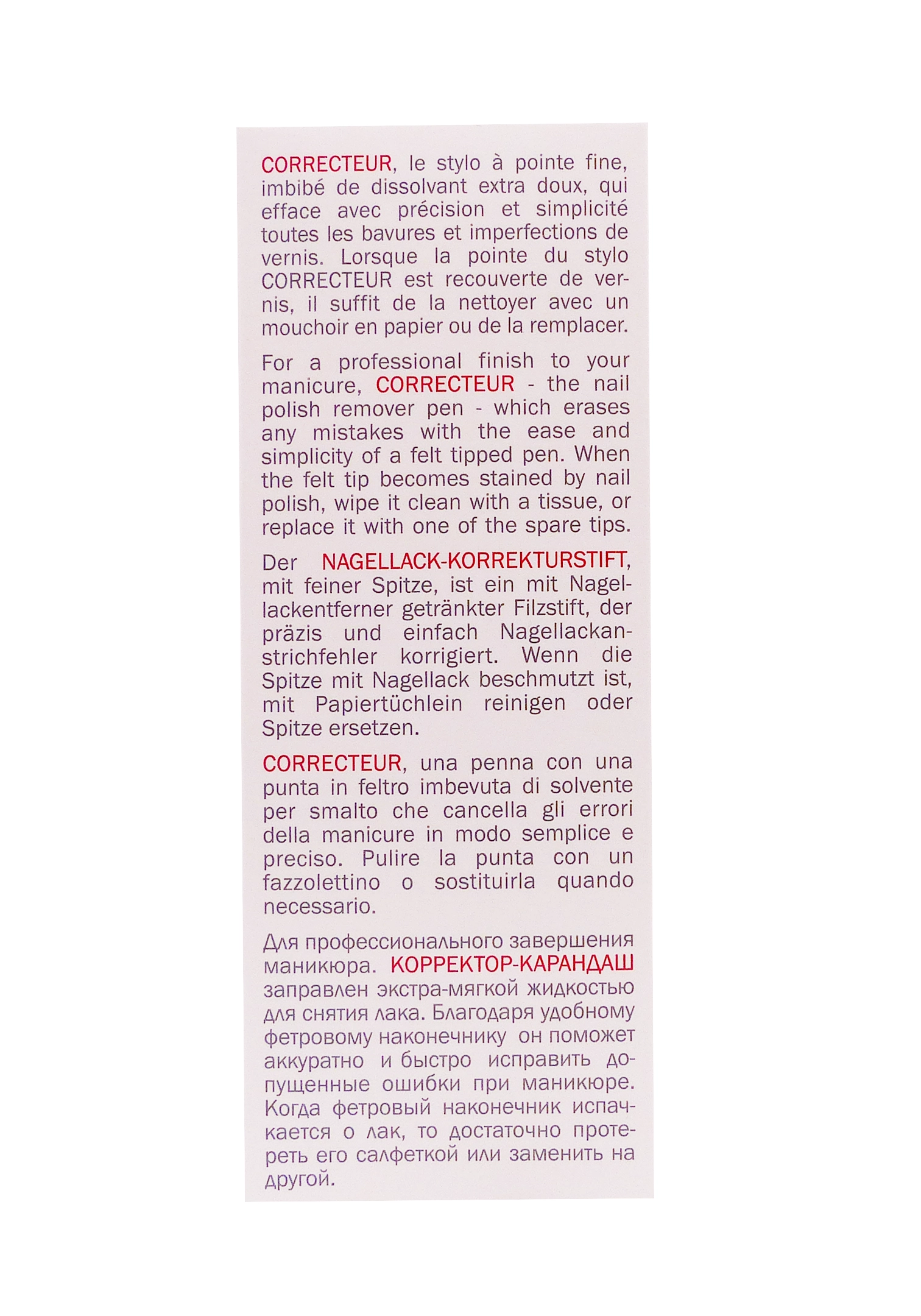 Grâce à sa pointe en feutre fine, le stylo correcteur Mavala offre une correction précise et facile, idéale pour les manucures maison ou professionnelles. Imbibé d’un dissolvant extra-doux sans acétone, il agit rapidement et efficacement sans irriter la peau ni abîmer les cuticules. La formule est respectueuse des ongles et du contour, garantissant un résultat net et soigné à chaque utilisation.