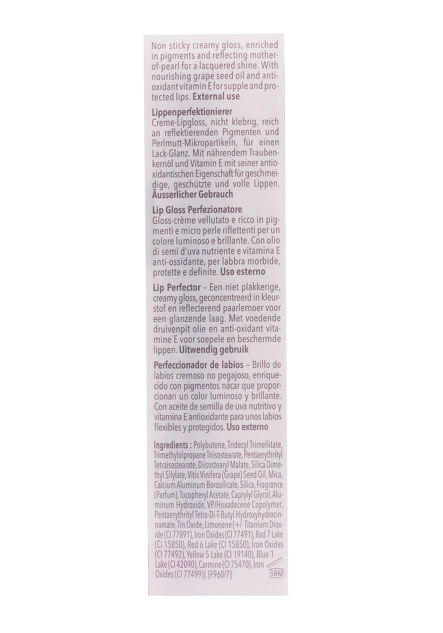 Une combinaison de polymères et d’esters émollients qui assurent la tenue et la douceur du gloss sans effet collant. L’huile de pépin de raisin constitue le cœur de sa formule bienfaisante, apportant des acides gras essentiels (notamment oméga-6) qui nourrissent, régénèrent et protègent la barrière cutanée des lèvres.​