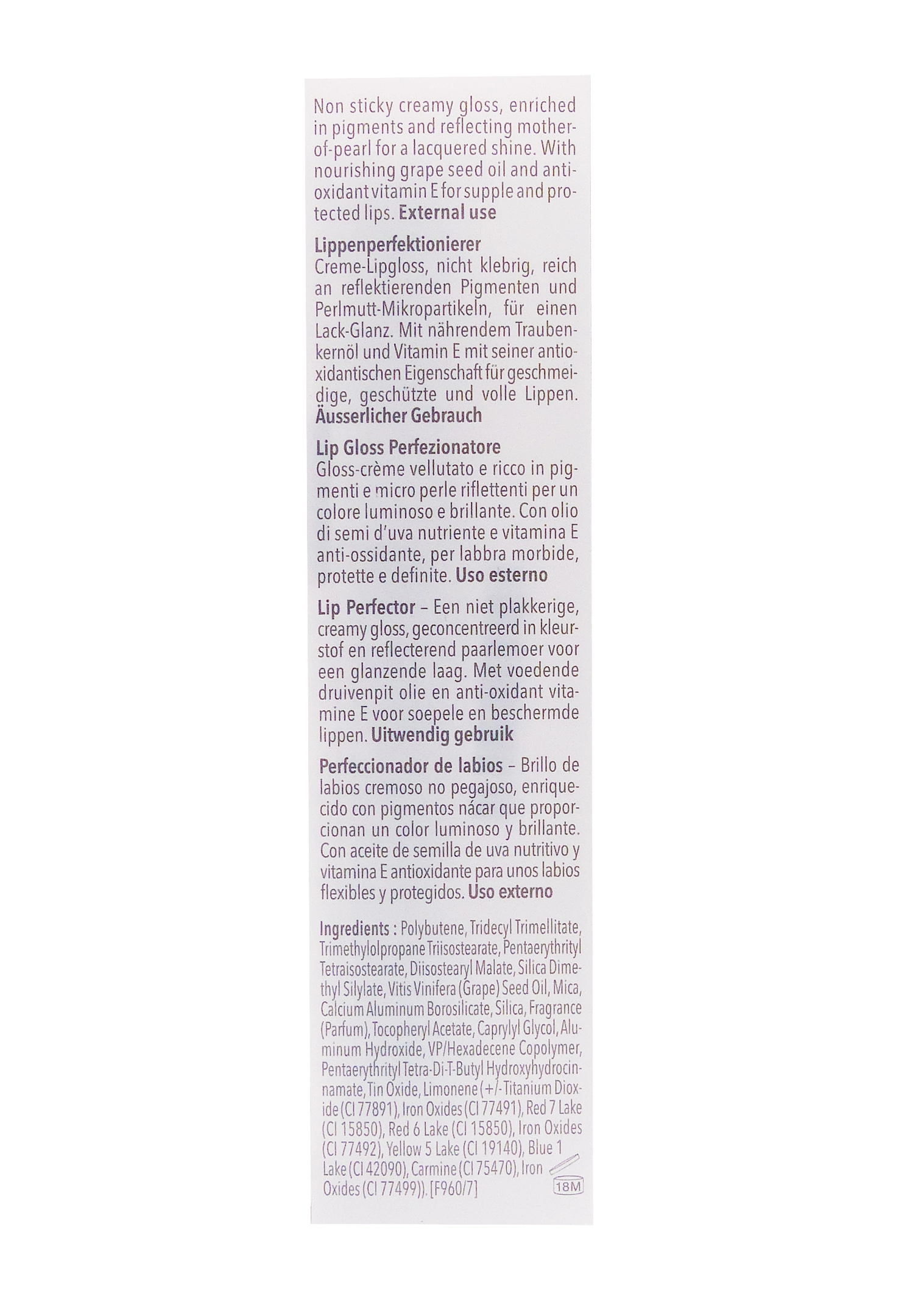 La formule intègre un mélange équilibré de polymères et d’esters émollients, offrant un toucher doux et une excellente tenue sans effet collant ni lourdeur. De fines particules nacrées illuminent la teinte tout en gardant un rendu naturel et lumineux, pour des lèvres sublimées à chaque application.