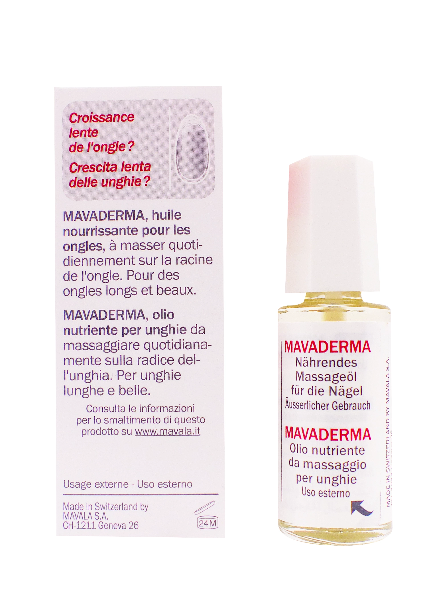 L’huile de massage Mavala Mavaderma 10 ml est un soin expert pour ongles, formulé pour stimuler la croissance, renforcer la structure et améliorer la beauté des ongles. Développée par le laboratoire Mavala, reconnu pour ses innovations en soins des ongles, cette huile de massage combine trois huiles végétales de qualité : germe de blé, olive et amande douce, pour une action nourrissante et revitalisante en profondeur.
