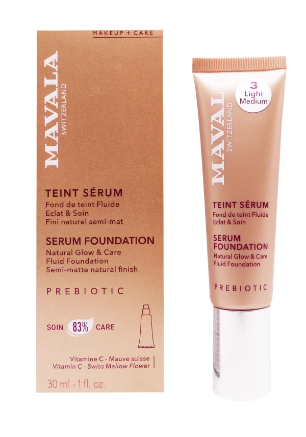 Mavala teint sérum medium 30 ml est un fond de teint fluide à 83% d’ingrédients soin qui unifie, illumine et protège la peau tout en offrant une couvrance modulable et un fini semi-mat. Enrichi en vitamine C, prébiotiques et extrait de mauve suisse, il convient à tous les types de peau, même les plus sensibles, pour un teint frais, lumineux et naturel toute la journée.​