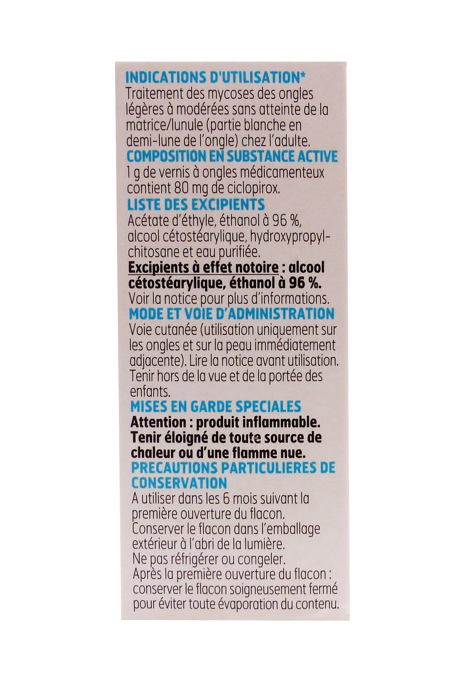 Myconail vernis à ongles médicamenteux 3,3 ml est un traitement antifongique local à base d’amorolfine, indiqué chez l’adulte pour les mycoses des ongles légères à modérées sans atteinte de la matrice unguéale. Ce vernis incolore forme une pellicule fine qui diffuse l’actif dans la kératine de l’ongle pour combattre les champignons dermatophytes, levures et moisissures responsables des infections, favorisant la repousse d’un ongle sain.