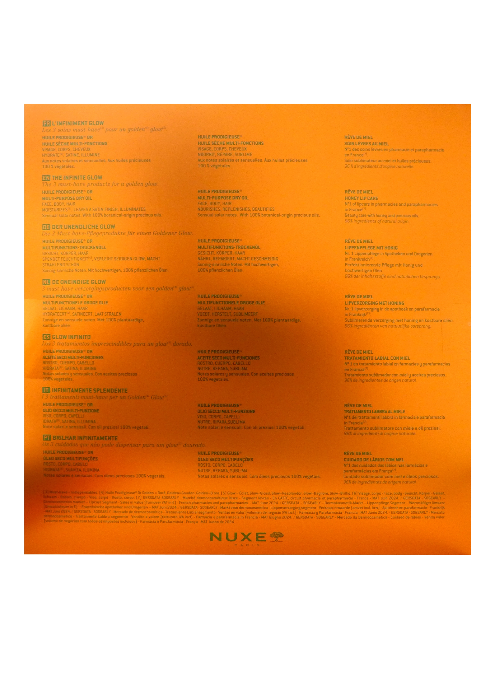 La Huile Prodigieuse Or est un soin multi-usage emblématique du laboratoire Nuxe, choisi par celles et ceux qui recherchent une beauté au naturel sublimée d’un éclat lumineux. Cette huile sèche pailletée allie sept huiles végétales précieuses à des nacres dorées d’origine naturelle, offrant ainsi à la peau et aux cheveux une nutrition intense, une réparation en profondeur et un effet lumineux délicat. Sa texture légère au toucher sec pénètre rapidement sans laisser de film gras, enveloppant le corps, le visage et les cheveux d’un voile satiné étincelant.
