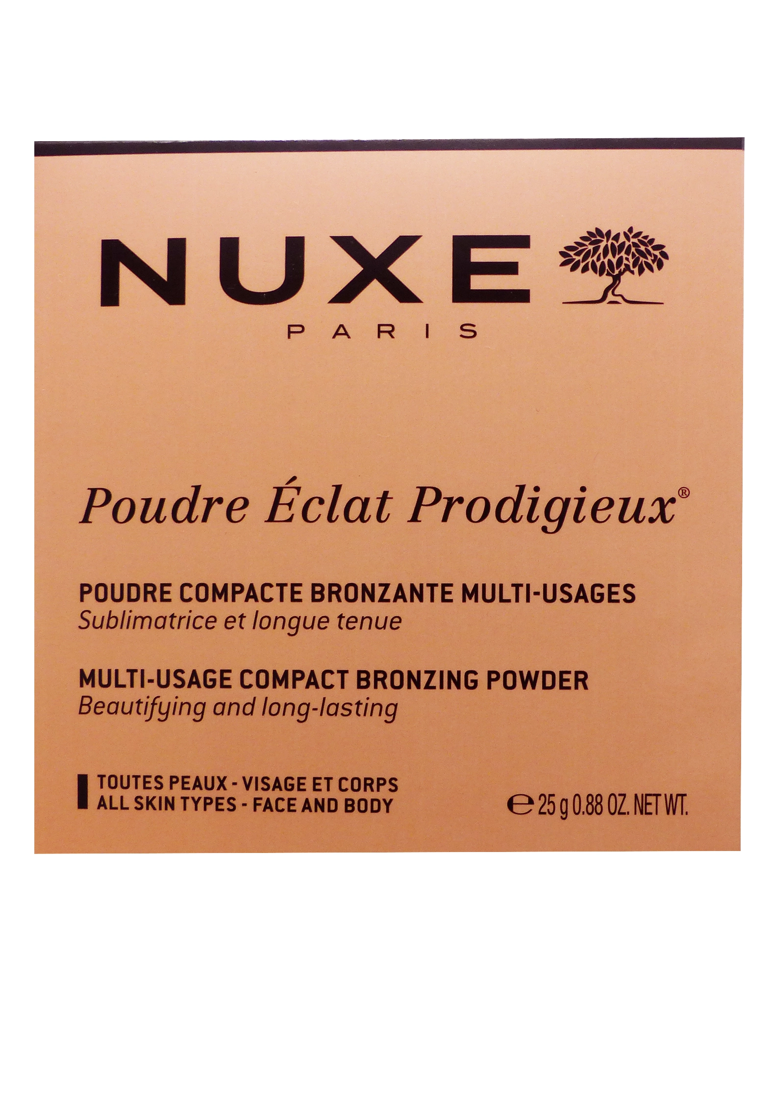 Nuxe Poudre Éclat Prodigieux Poudre Compacte Bronzante est une poudre multi-usages spécialement conçue pour sublimer le teint et intensifier le hâle, été comme hiver. Formulée par le Laboratoire Nuxe, reconnu pour ses innovations à base d’actifs naturels, cette poudre allie effet bonne mine immédiat, illumination du teint et longue tenue pour un résultat naturel et radieux. Sa texture fine et aérienne se dépose comme un voile de soleil, enveloppant la peau d’un hâle doré et velouté.