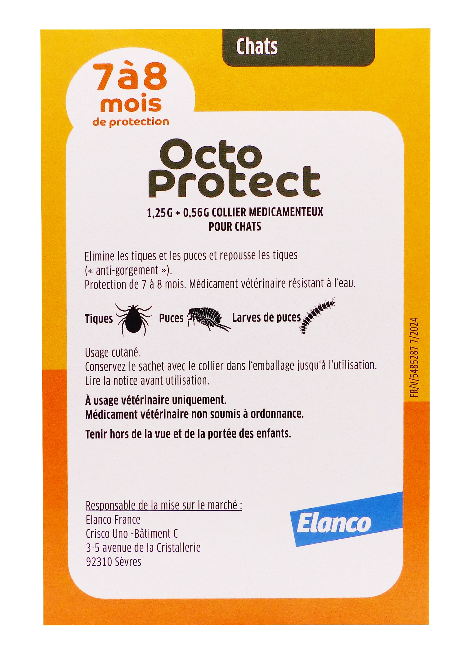 Le collier Octo Protect 1 collier gris 38 cm pour chats est un dispositif antiparasitaire de référence pour protéger efficacement les chats contre les principales menaces externes : puces, tiques, poux broyeurs et phlébotomes. Développé par Elanco, ce collier médicamenteux assure une protection longue durée, jusqu’à 8 mois, grâce à une action combinée insecticide et répulsive qui agit par simple contact avec les parasites.