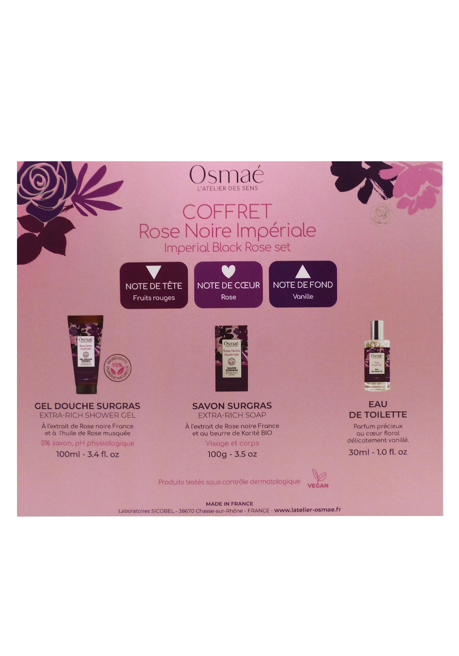 Le coffret Osmaé rose noire impériale est pensé comme un véritable rituel de soin pour les peaux délicates qui recherchent à la fois confort, douceur et sillage sophistiqué. Au cœur de ce coffret, la fragrance rose noire impériale joue sur un contraste entre sensualité florale, fruits rouges pétillants et fond vanillé réconfortant, pour un résultat à la fois gourmand, féminin et élégant. Ce coffret rose noire impériale Osmaé a été créé par les Laboratoires Sicobel, reconnus en parapharmacie pour leurs soins sensoriels respectueux de la peau, et se positionne comme un cadeau clé en main, prêt à offrir sans avoir besoin de le compléter.