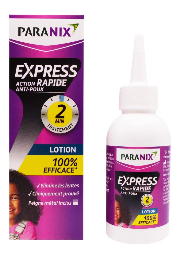 Paranix Express Action Rapide 2 Minutes Lotion 95 ml Peigne Inclus est un traitement express contre les poux et les lentes, conçu pour une utilisation rapide et efficace. Ce produit combine une lotion traitante et un peigne fin en métal pour garantir une élimination complète des poux et des lentes. Il est particulièrement adapté aux enfants et aux adultes, et convient à toute la famille et enfants de plus de 2 ans. La technologie LPF® (Longue Protection Paranix) rend le cuir chevelu moins attractif pour les poux, offrant une protection contre les réinfestations pendant 72 heures.