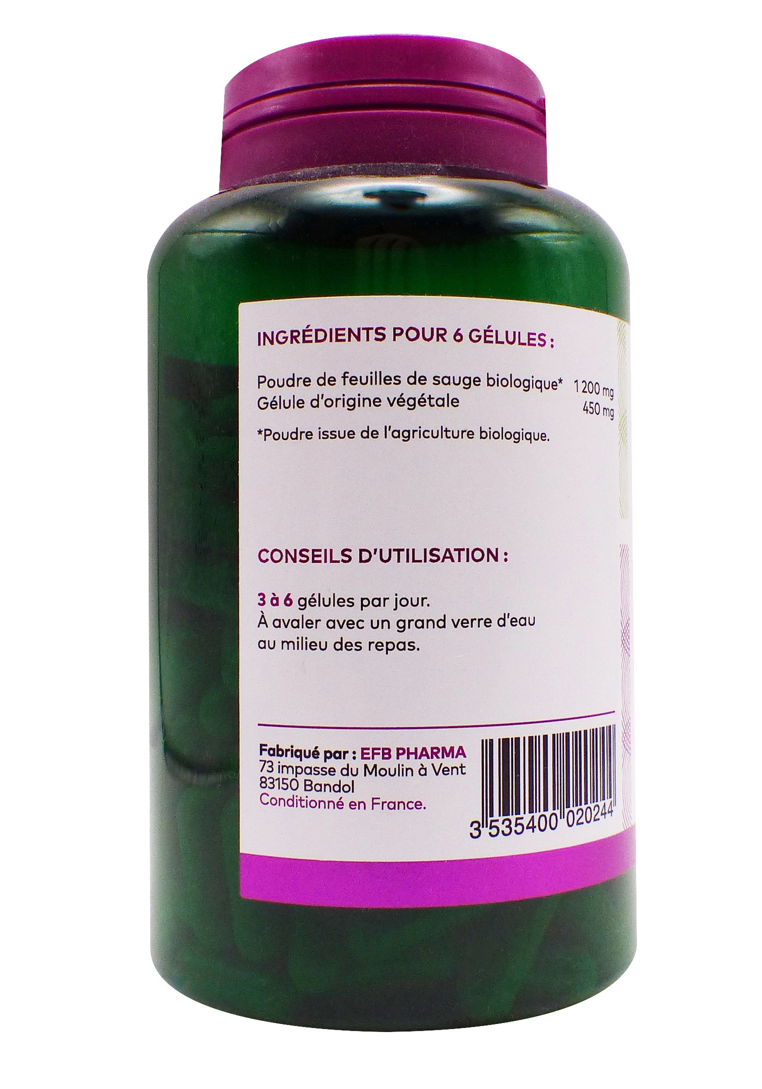 100% bio et naturel : poudre de feuilles de sauge issue de l’agriculture biologique, gélules végétales sans additifs inutiles.