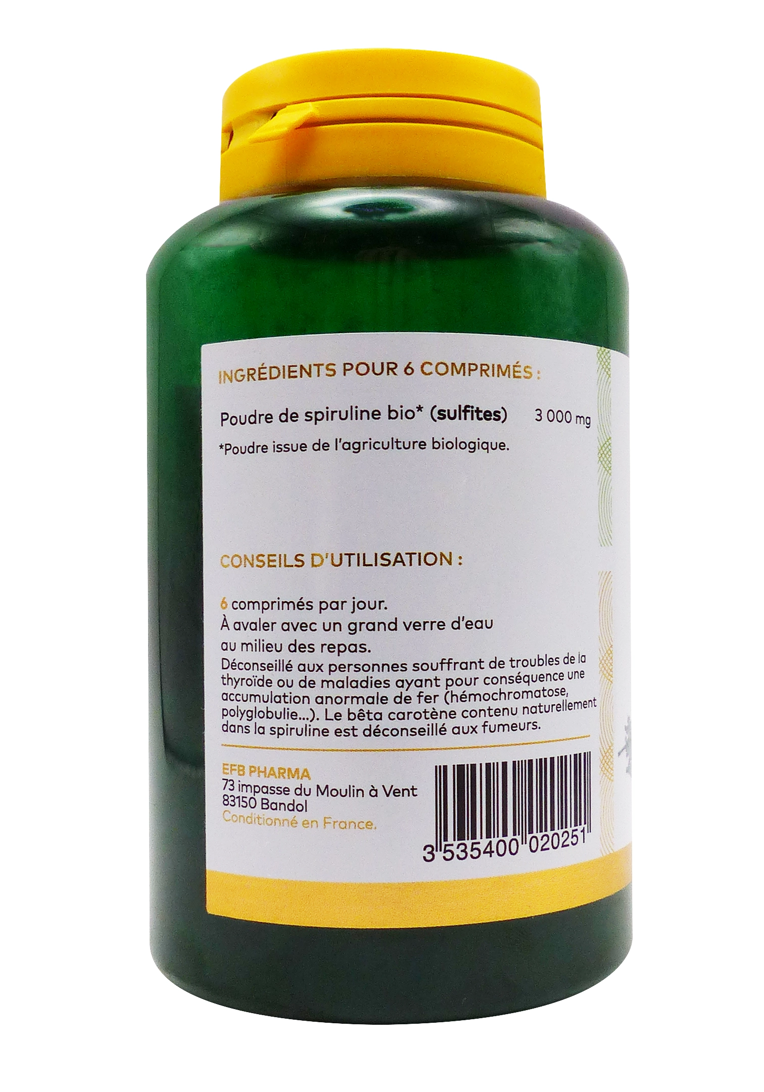Spiruline bio concentrée : 3000 mg par dose journalière (6 comprimés), source naturelle de protéines végétales (jusqu’à 60-70%), fer et vitamines pour booster l’énergie et combattre la fatigue saisonnière.