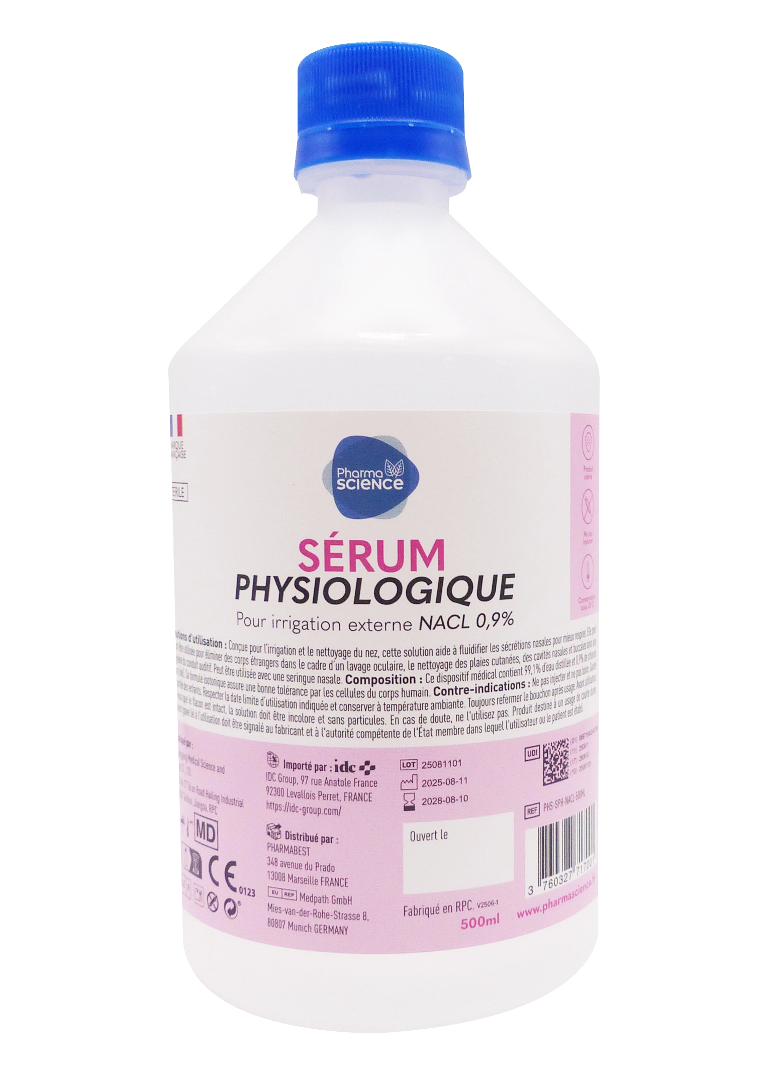 Le sérum physiologique 0,9%, 500 ml Pharmascience est une solution stérile à base de chlorure de sodium, conçue pour l’hygiène quotidienne et les soins du corps. Présenté en flacon de 500 ml, il convient parfaitement à un usage familial ou régulier. Sa formule isotonique respecte l’équilibre naturel des tissus et peut être utilisée aussi bien pour le nettoyage des yeux, du nez, des plaies superficielles que pour l’hydratation des muqueuses. Polyvalent, doux et sans conservateur, il est adapté à toute la famille, y compris les nourrissons.