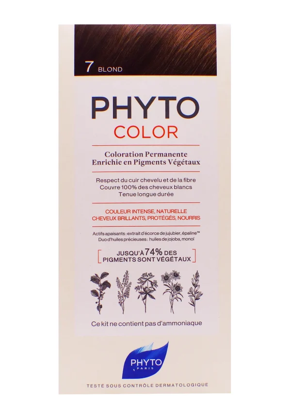 Phyto Color 7 Blond est une coloration permanente spécialement conçue pour apporter une couleur intense, naturelle et lumineuse aux cheveux. Ce kit coloration Phyto 7 Blond associe une formule innovante enrichie en pigments végétaux issus de cinq plantes tinctoriales, pour garantir une couverture optimale des cheveux blancs dès la première application. La présence d’huiles précieuses, comme l’huile de Jojoba et l’huile de Monoï, nourrit et booste la brillance de la chevelure, tandis que l’extrait d’écorce de Jujubier et l’Epaline™ protègent le cuir chevelu et limitent les sensations d’inconfort.