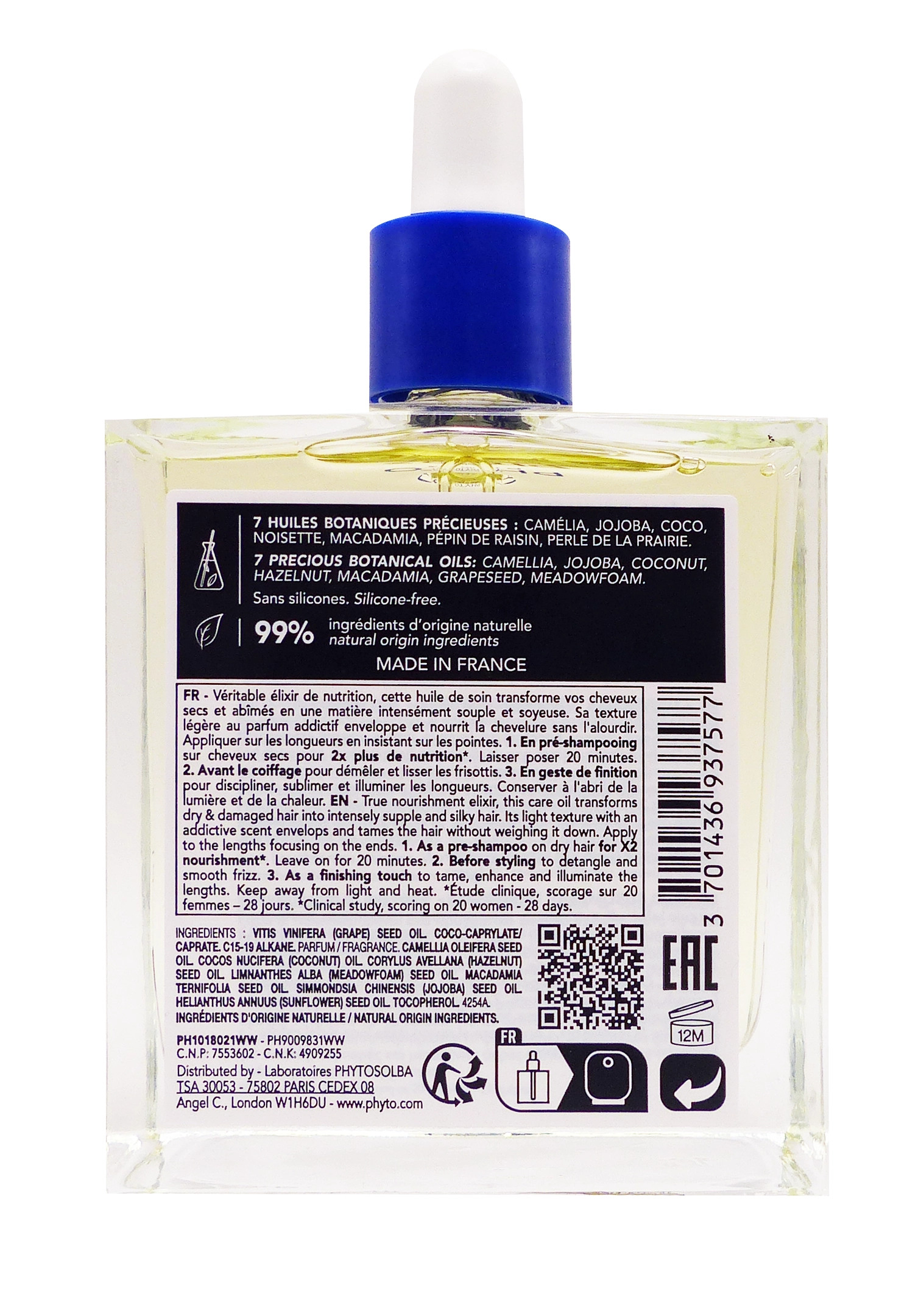 Le laboratoire Phyto, réputé pour ses formulations à base d’actifs végétaux, a développé ce soin en privilégiant des ingrédients naturels et efficaces. L’huile Phyto 7 Elixir contient un mélange d’huiles végétales (comme l’huile d’argan, l’huile de jojoba, l’huile d’olive ou d’autres huiles précieuses) qui agissent en synergie pour restaurer le film hydrolipidique du cheveu, renforcer la cuticule et protéger contre la déshydratation et la casse. Ces actifs végétaux sont reconnus pour leur pouvoir nourrissant, protecteur et réparateur, et permettent de retrouver des cheveux plus forts, plus sains et plus beaux au fil des utilisations.