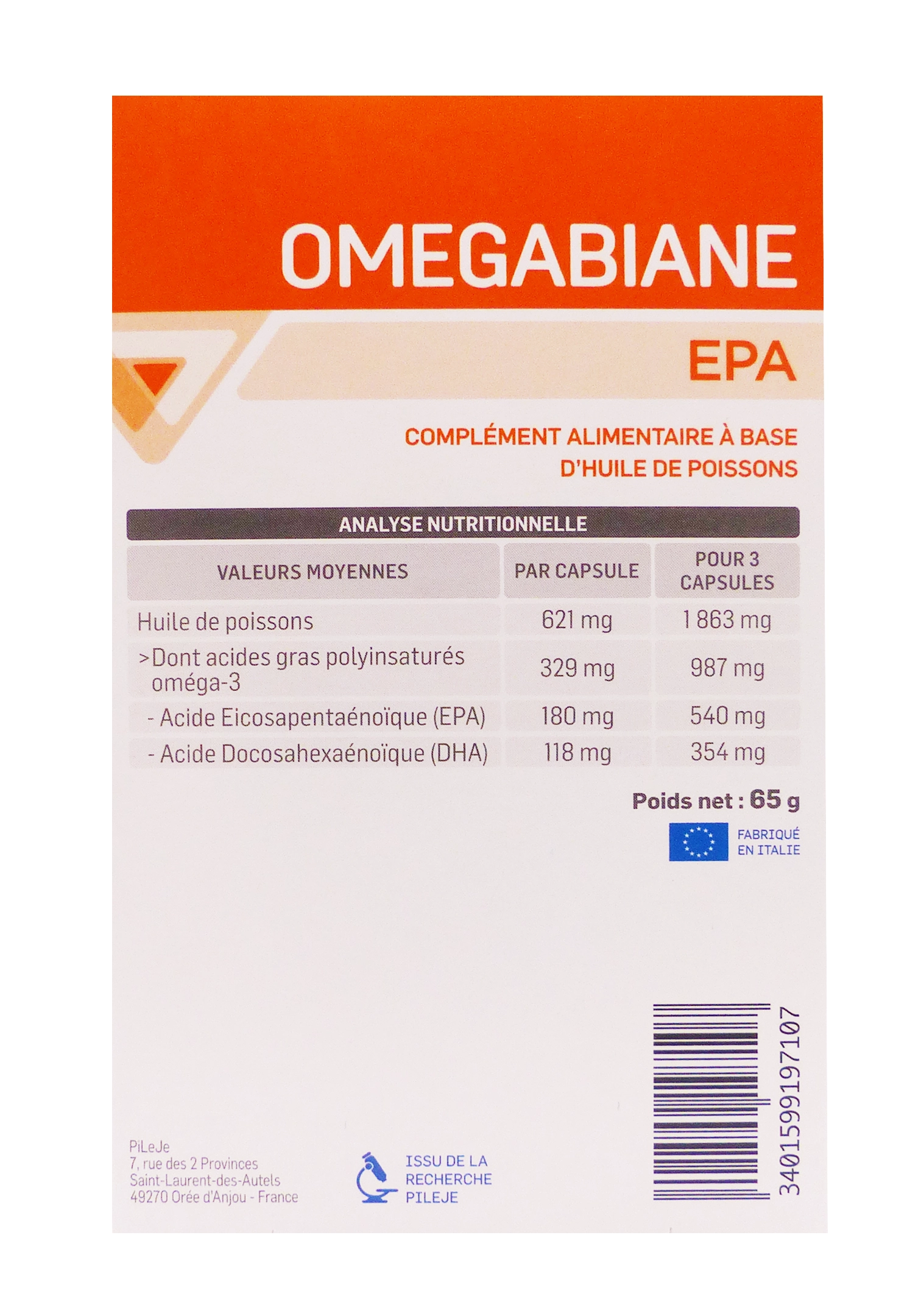Omegabiane EPA 80 capsules est un complément alimentaire développé par le laboratoire PiLeJe, formulé à base d’huile de poisson concentrée riche en acides gras oméga-3, notamment en EPA (acide eicosapentaénoïque). Il est particulièrement recommandé pour soutenir le bon fonctionnement du système cardiovasculaire et rééquilibrer les apports en oméga-3 souvent insuffisants dans l’alimentation moderne. Grâce à une sélection rigoureuse des huiles de poisson et des procédés de purification avancés, ce produit garantit une haute qualité et une excellente assimilation par l’organisme.