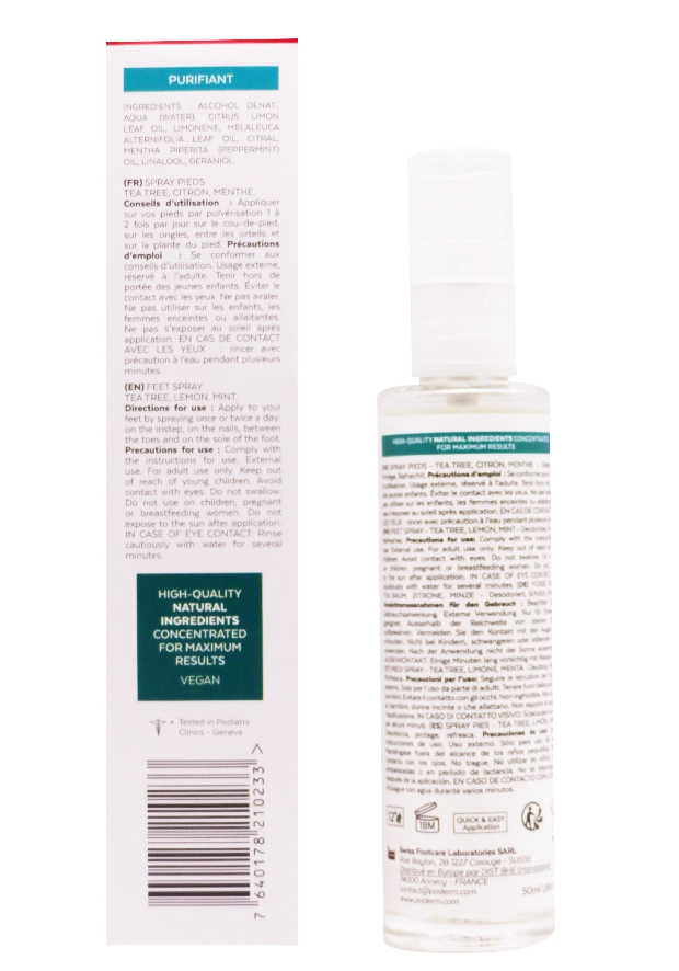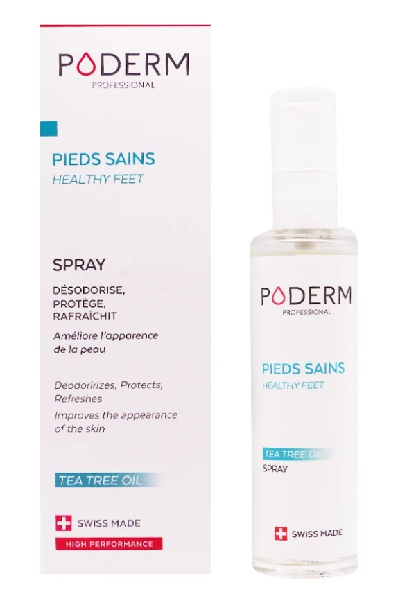 Poderm Spray Pieds Sains 50 ml est un soin purifiant professionnel conçu par le laboratoire suisse Poderm, spécialiste des solutions podologiques naturelles. Ce spray agit en prévention et traitement des mycoses du pied (pied d’athlète), des infections cutanées et des odeurs désagréables, grâce à une formule sans parabènes, sans sulfates et sans alcool dénaturé irritant.