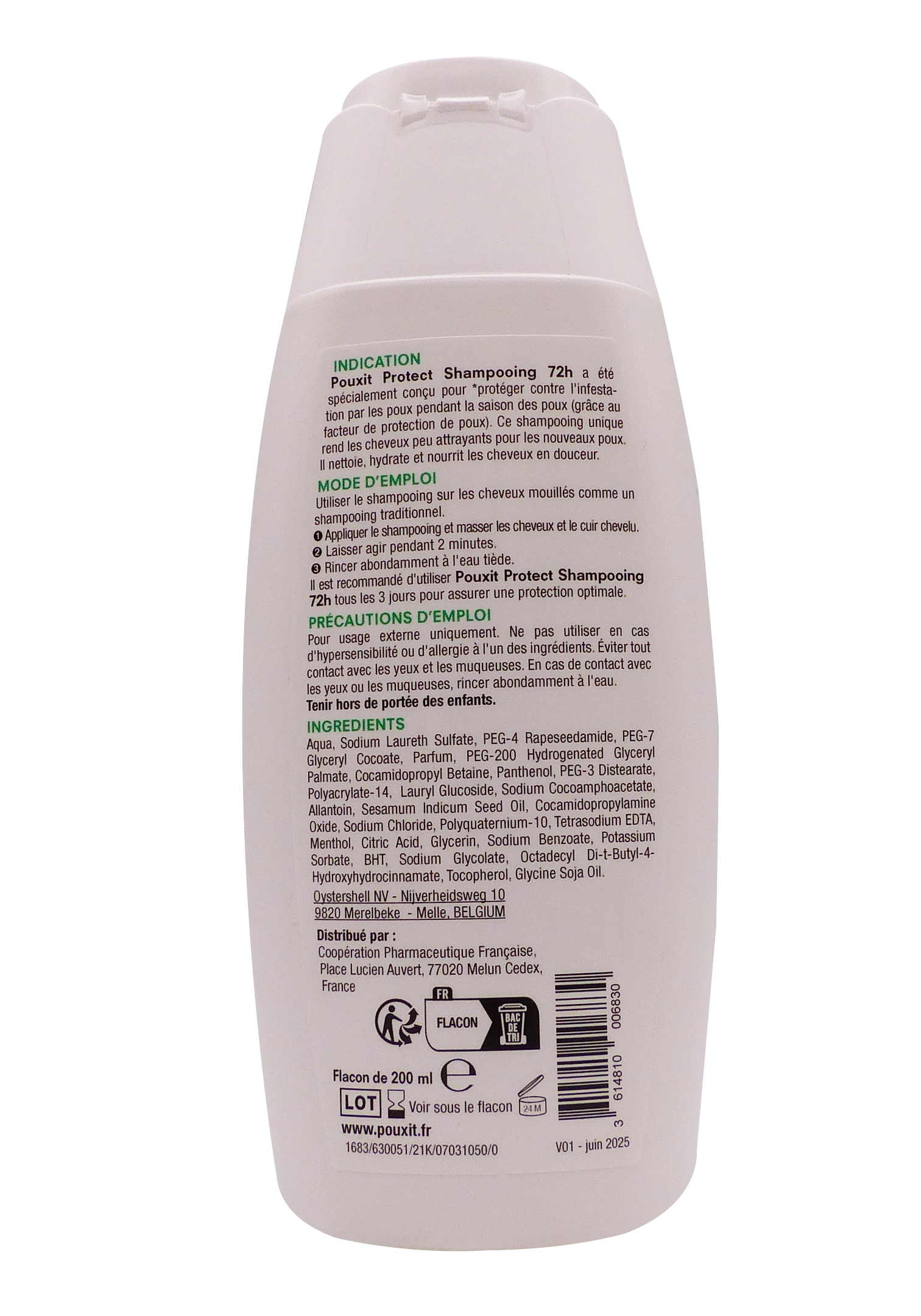 Pouxit Protect Shampooing Lavant Protecteur 72h, 200 ml est un shampooing protecteur spécialement formulé pour prévenir les infestations de poux et protéger les cheveux contre les réinfestations. Ce produit est particulièrement adapté aux enfants et aux adultes, et convient à toute la famille. La technologie LPF® (Longue Protection Pouxit) rend le cuir chevelu moins attractif pour les poux, offrant une protection contre les réinfestations pendant 72 heures.