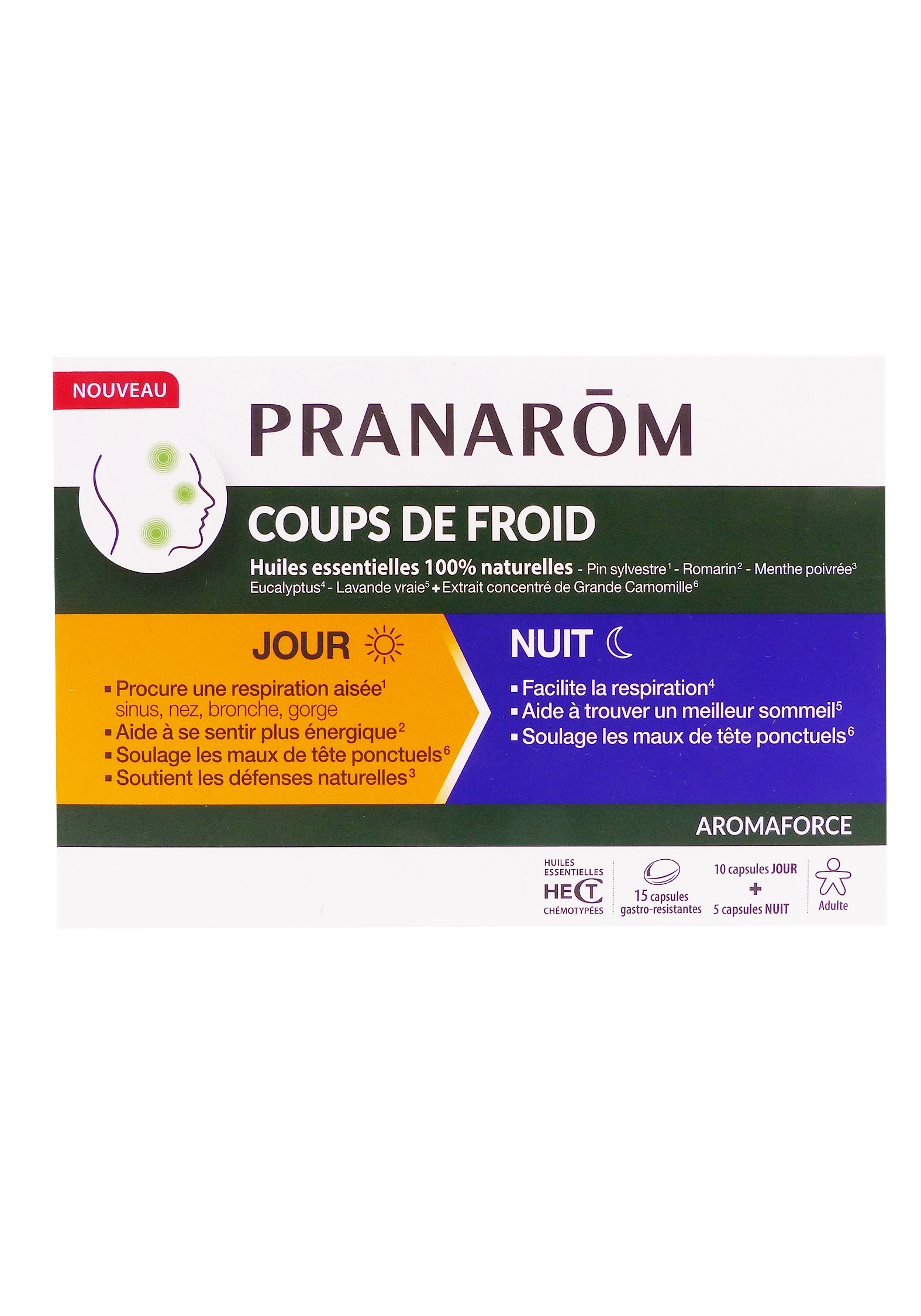 Pranarom Coup de Froid Jour Nuit Aromaforce 15 capsules est un complément naturel de haute qualité conçu pour accompagner efficacement l’organisme face aux premiers signes du rhume et aux refroidissements saisonniers. Issu d’une expertise reconnue en aromathérapie, ce produit allie la synergie de plantes médicinales et d’huiles essentielles sélectionnées pour leur action ciblée sur les défenses immunitaires et le confort respiratoire.