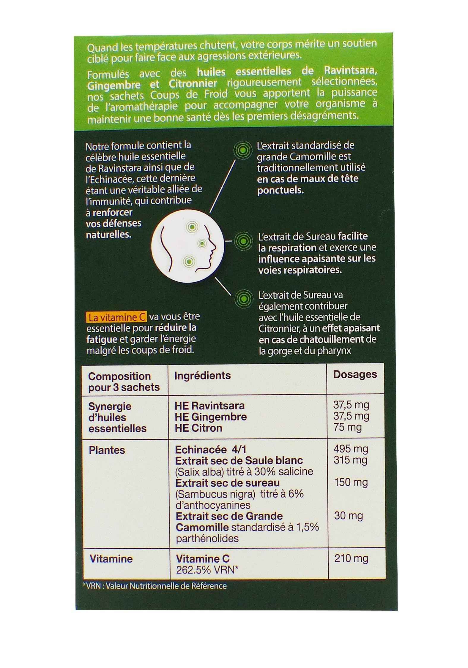 Plantes : Echinacée (495mg), Extrait de Saule blanc (315mg),Extrait sec de Sureau (150mg), Extrait sec de Grande Camomille (30mg)