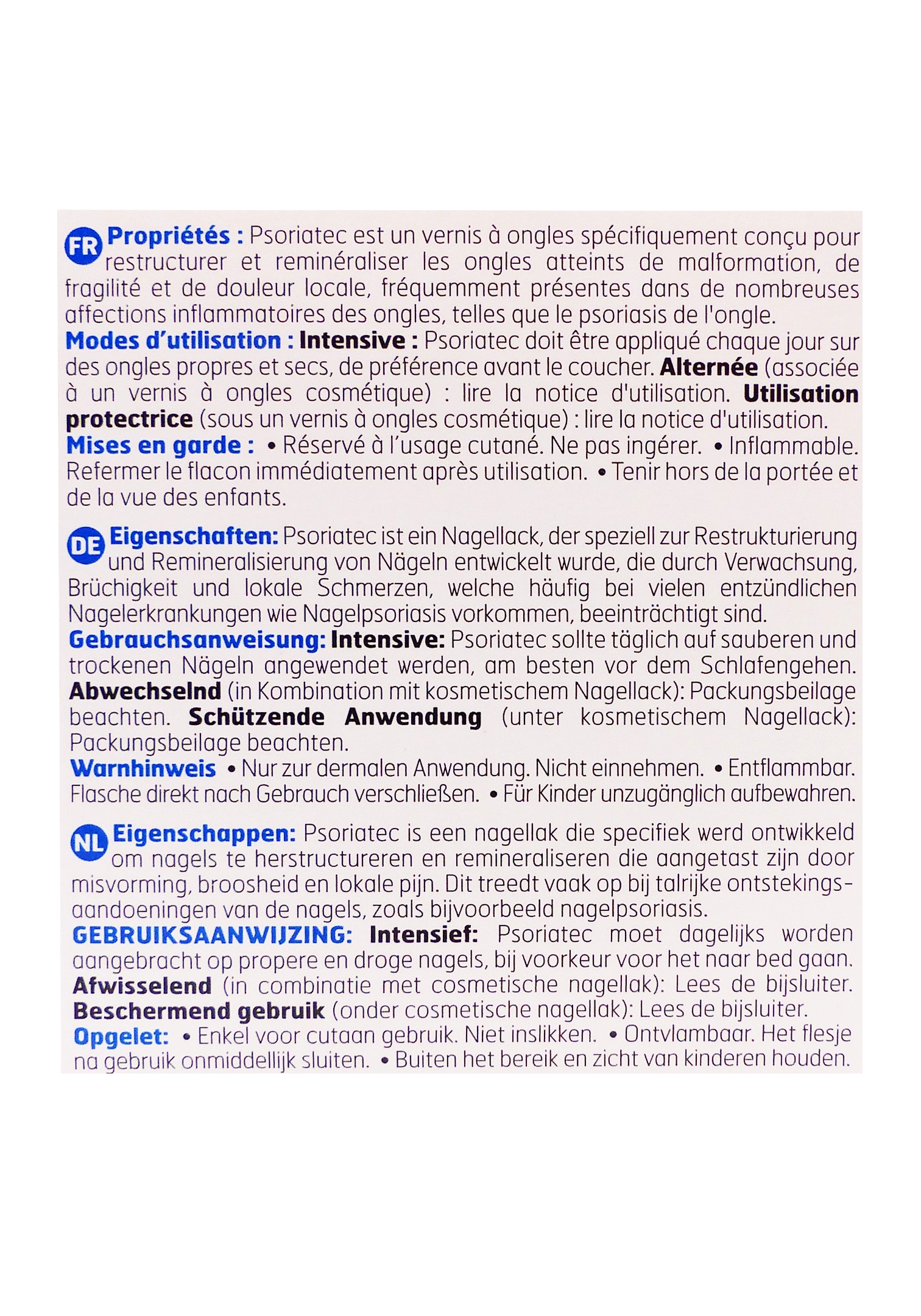 Psoriatec vernis est-t-il Compatible avec le vernis pour ongles cosmétique ? Oui, appliquez Psoriatec dessous comme base protectrice.