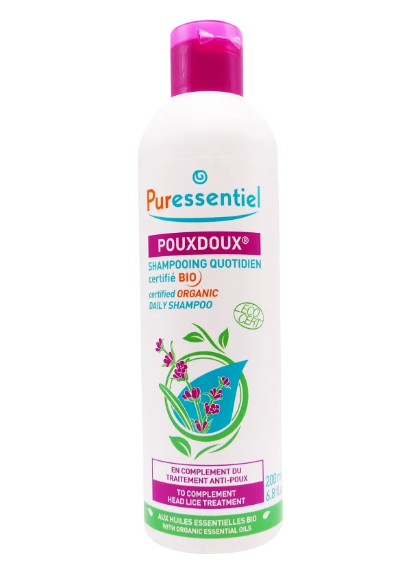 Puressentiel Pouxdoux Shampooing Quotidien 200 ml est un soin capillaire naturel conçu pour traiter et prévenir les infestations de poux et lentes chez les enfants et les adultes. Ce shampooing quotidien anti-poux Puressentiel associe une formule douce à base d’huiles essentielles pures et naturelles (Cèdre, Lavande, Géranium, Tea Tree, Ravensare, Orange douce) pour envelopper et étouffer les poux et lentes sans les asphyxier. Grâce à sa composition non agressive, il convient aux enfants de plus de 3 ans et aux peaux sensibles, offrant une tolérance optimale et une protection maximale.