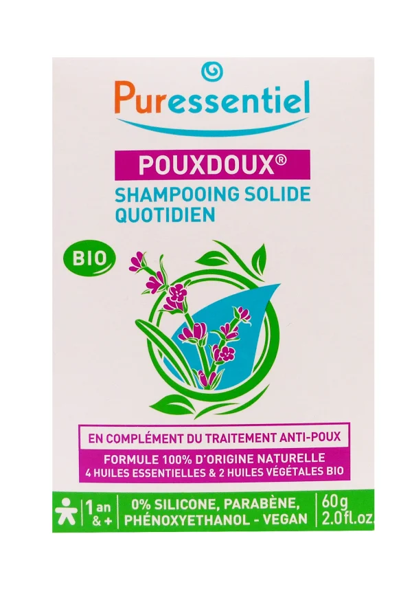 Puressentiel Pouxdoux Shampooing Solide Quotidien Bio 60g est un soin capillaire naturel et efficace formulé pour traiter et prévenir les infestations de poux chez les enfants et les adultes. Ce shampooing solide anti-poux Puressentiel associe l’action mécanique à une formule bio, sans pesticides ni ingrédients chimiques, pour envelopper et étouffer les poux et lentes sans les asphyxier. Grâce à sa composition à base d’huiles essentielles, il offre une protection naturelle et une tolérance optimale, même sur les cuirs chevelus sensibles.