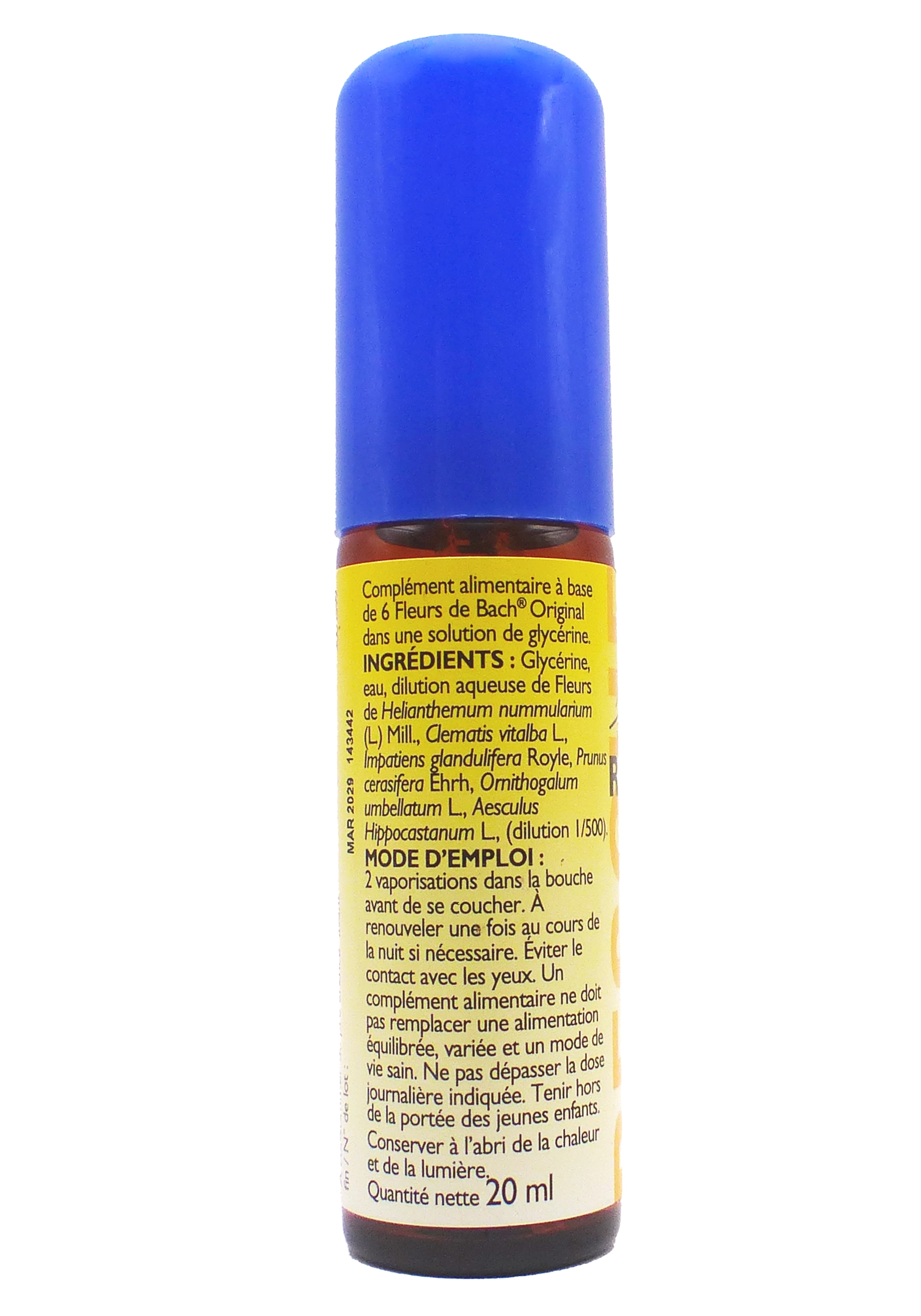 Rescue Spray Nuit 20 ml est un produit naturel de haute qualité formulé à partir d’un mélange exclusif de six fleurs de Bach, soigneusement choisi pour favoriser un sommeil paisible et réparateur. Ce spray associe les cinq fleurs du Rescue® original — Cherry Plum (Prunier Myrobolan), Clematis (Clématite), Impatiens (Impatiente), Rock Rose (Hélianthème), Star of Bethlehem (Étoile de Bethléem) — avec la fleur de White Chestnut (Marronnier Blanc), réputée pour apaiser les pensées obsédantes.