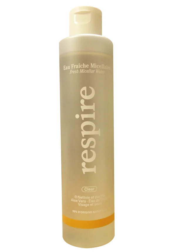 L’eau fraîche micellaire Respire 200 ml est un soin démaquillant et nettoyant doux, formulé à 99% d’ingrédients d’origine naturelle🌿, conçu pour purifier la peau tout en la respectant. Adaptée aux peaux sensibles, cette eau micellaire associe les vertus apaisantes de l’eau florale de thym BIO et l’hydratation de l’aloe vera BIO pour offrir un nettoyage efficace, une fraîcheur intense et un confort optimal au quotidien.