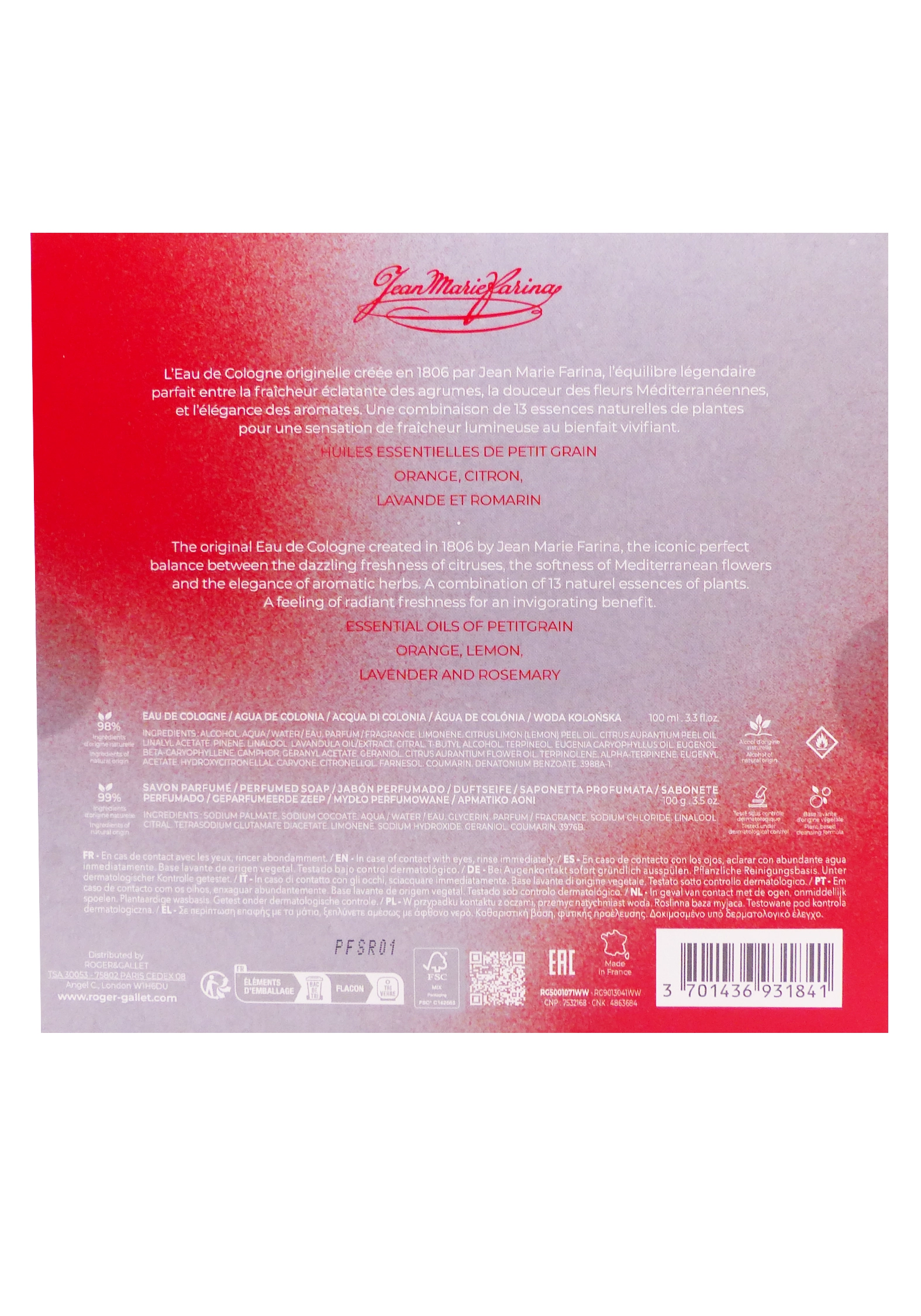Le cœur du coffret est l’Eau de Cologne Jean-Marie Farina, une composition unique qui mêle habilement la fraîcheur éclatante des agrumes (citron, bergamote, orange) à la douceur des aromates méditerranéens comme la lavande, le romarin et le thym. Ce parfum mythique, dont la formule secrète a traversé les siècles inchangée, procure une sensation inégalée de fraîcheur vivifiante et de sérénité.
