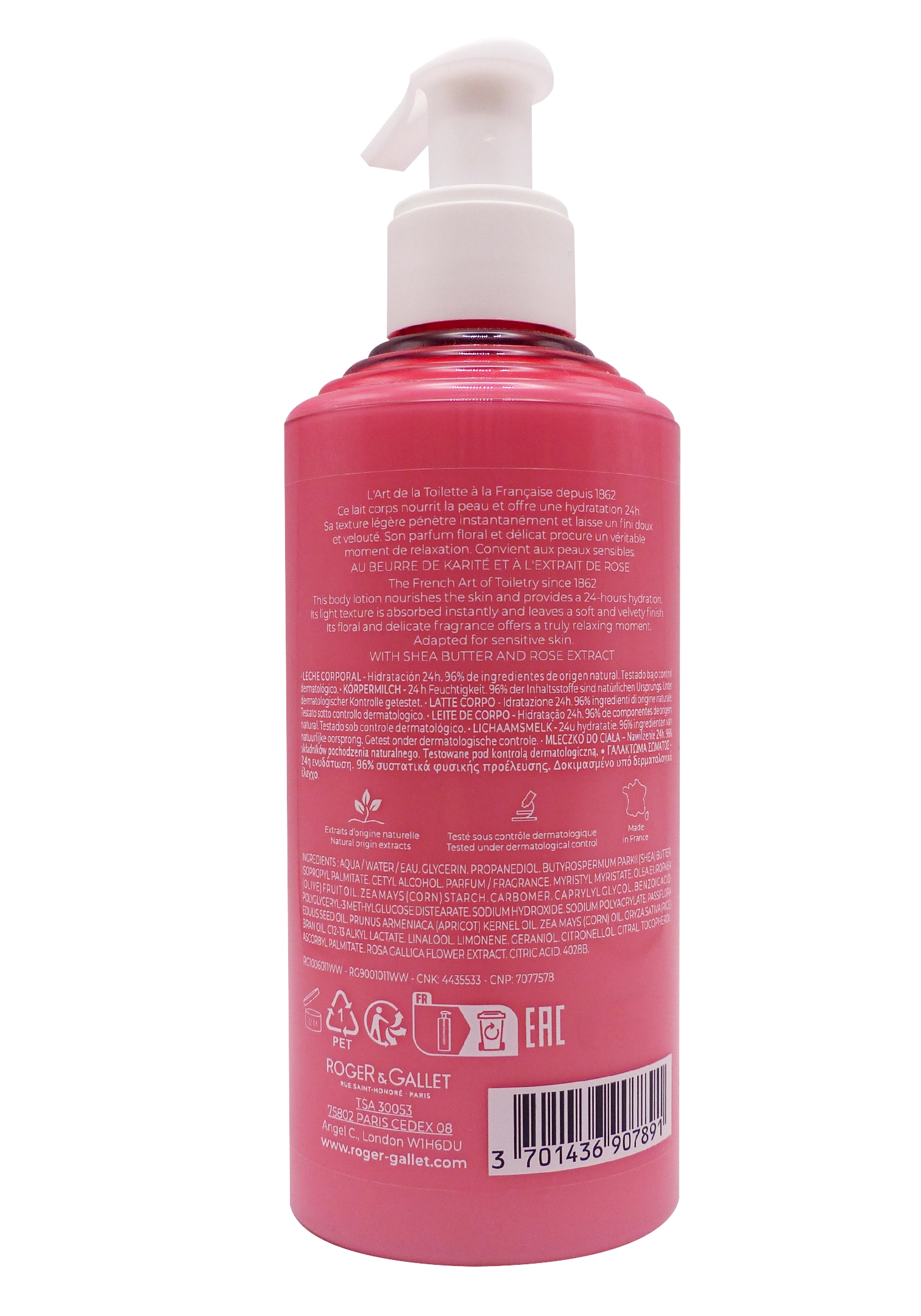 Composition du lait corps Rose Roger & Gallet 250 ml :