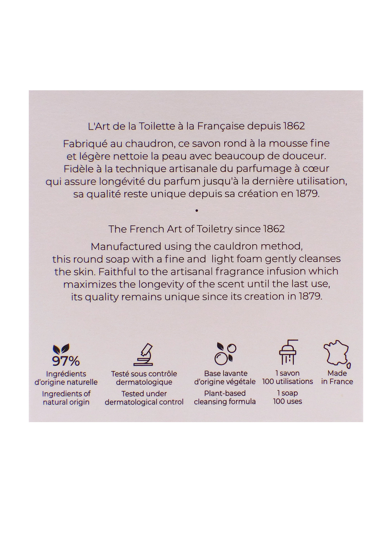Grâce à sa technique de parfumage “à cœur”, la fragrance persiste jusqu’à la dernière utilisation, procurant une sensation durable de fraîcheur et de vitalité. Le savon allie efficacité, naturalité et design emblématique avec son emballage “plissé soleil” aux couleurs vibrantes, signe d’une élégance et d’une qualité reconnues depuis 1879.