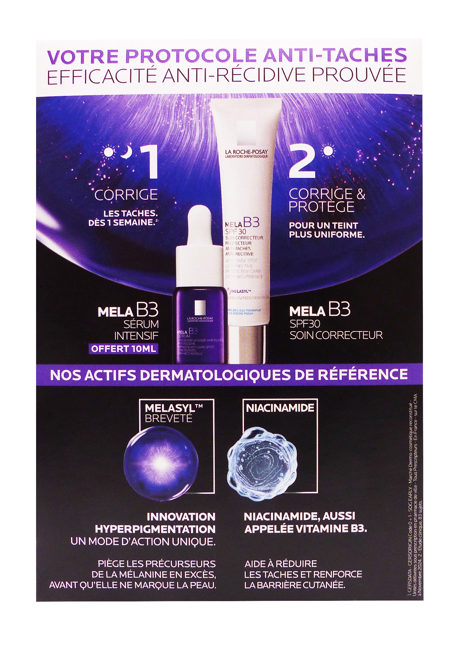 Le coffret inclut également un sérum intensif Mela B3 10 ml, concentré en actifs correcteurs, qui cible les zones les plus marquées pour intensifier les résultats. Sa texture légère et rapidement absorbée permet une action ciblée, idéale pour traiter les zones rebelles et renforcer l’efficacité globale de la routine.