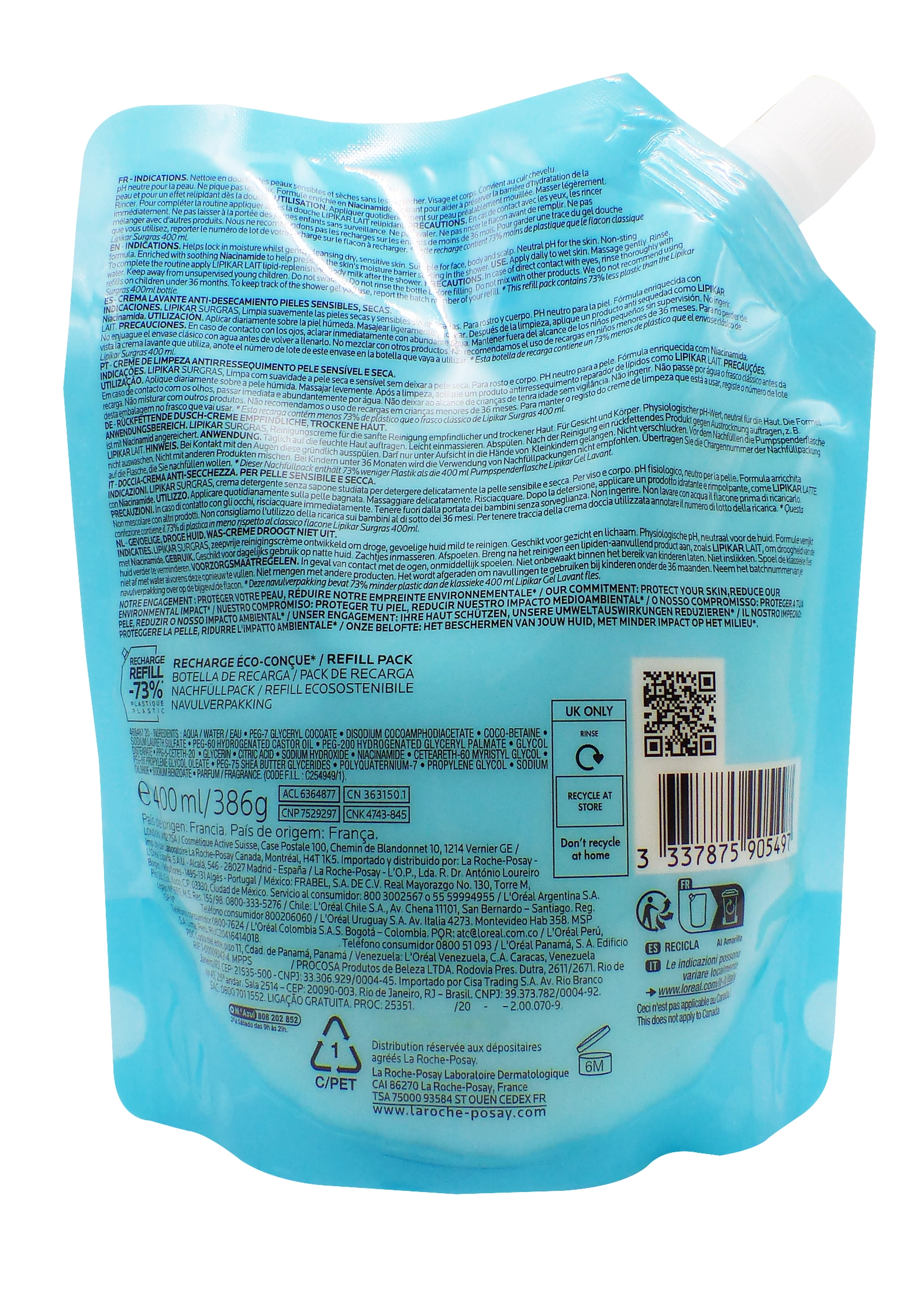 La Roche-Posay Recharge Crème Lavante Lipikar Surgras 400 ml est une solution innovante et écologique🌿, proposée par le laboratoire dermatologique La Roche-Posay, conçue pour prolonger l’utilisation de la crème lavante Lipikar Surgras tout en réduisant l’impact environnemental. Ce format recharge permet à la fois d’assurer un nettoyage très doux et une récupération optimale de la barrière cutanée des peaux très sèches, sensibles ou atopiques.