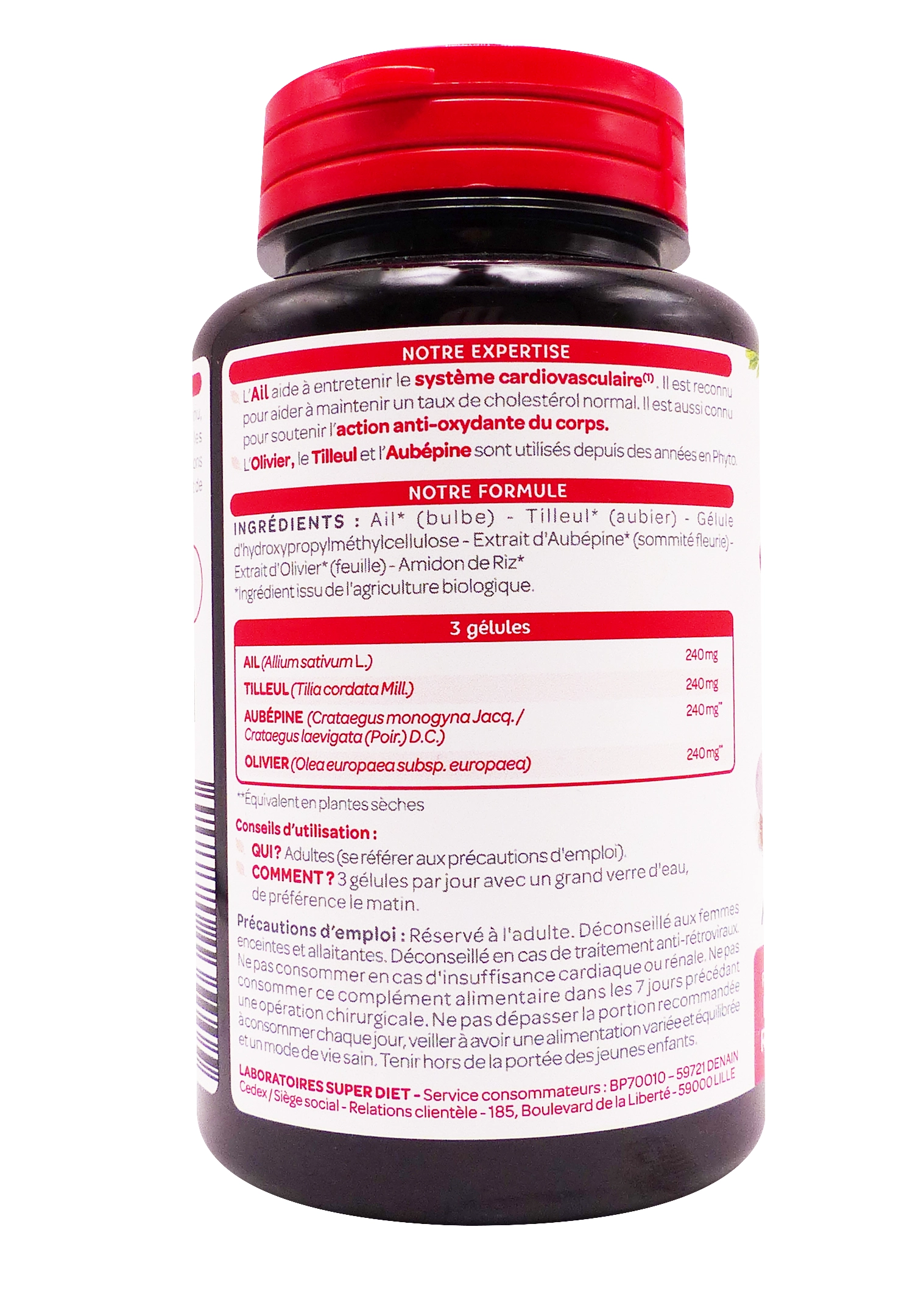 Ce produit associe des plantes issues de l’agriculture biologique pour favoriser l’entretien du cœur et des vaisseaux sanguins : l’ail aide à maintenir un bon taux de cholestérol et soutient l’action antioxydante, tandis que l’olivier, le tilleul et l’aubépine complètent l’action pour une circulation saine et un équilibre cardiovasculaire. Il est présenté en flacon de 150 gélules végétales (hydroxypropylméthylcellulose ou gélatine de poisson selon les lots), pour une cure de 50 jours à raison de 3 gélules par jour.