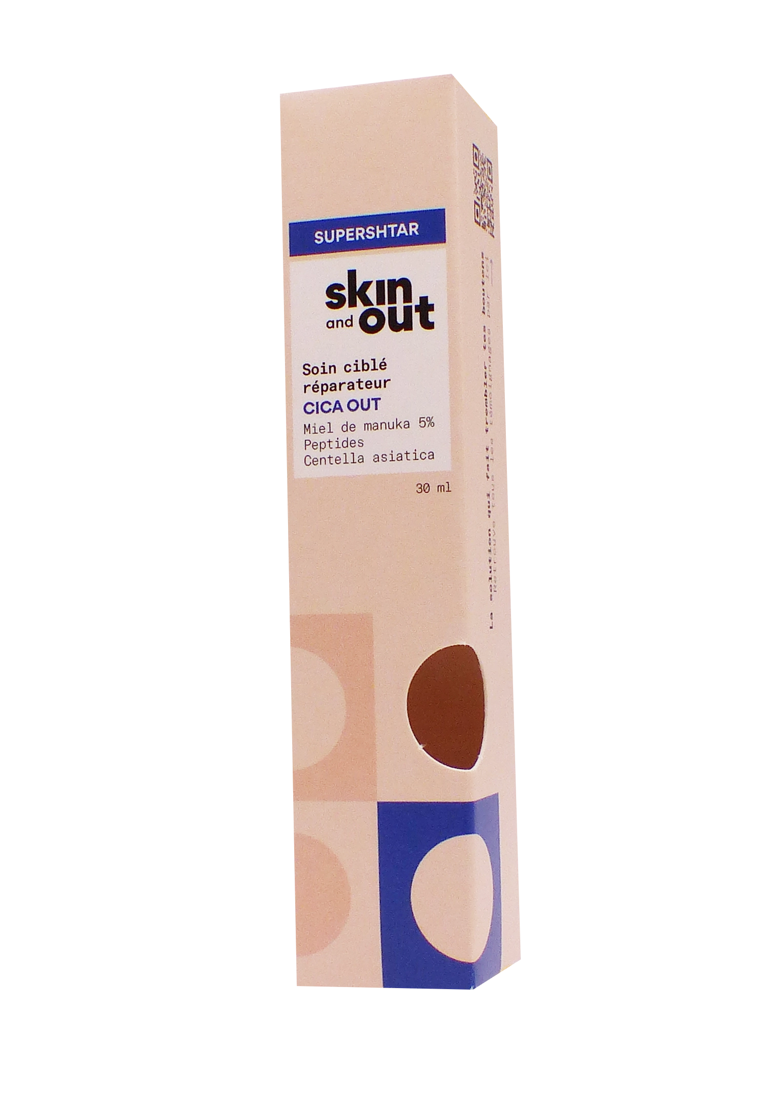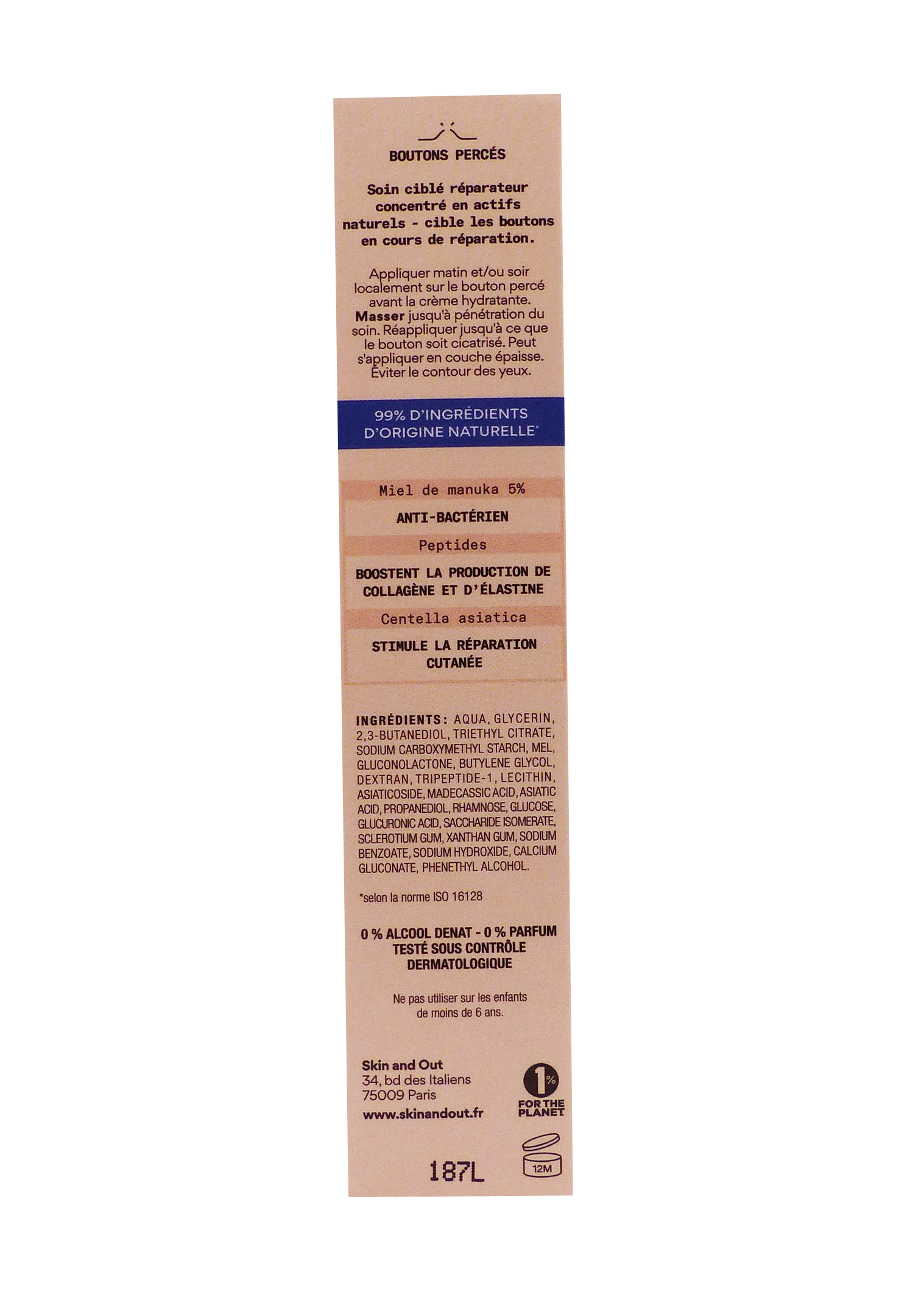 Skin & Out Cica Out Soin Ciblé Réparateur 30 ml est un soin SOS pour boutons d’acné percés ou irrités, accélérant la cicatrisation en milieu humide grâce à 5% de miel de Manuka antibactérien, peptides stimulateurs de collagène et Centella Asiatica prévenant les marques résiduelles. Sa formule clean 🌿apaise, répare et protège contre infections, pour une peau lisse et unifiée sans croûtes.