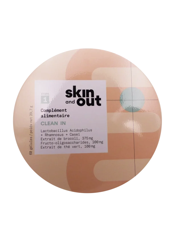 Skin & Out Clean In Étape 1, 60 gélules est un complément alimentaire purifiant de la routine In & Out contre l’acné adulte, conçu pour préparer le terrain en renforçant les organes filtres (foie, intestins) et rééquilibrant le microbiote intestinal. Cette première étape libère l’organisme des toxines internes favorisant les boutons, avec probiotiques, prébiotiques, brocoli détoxifiant et thé vert antioxydant, avant Clear In.