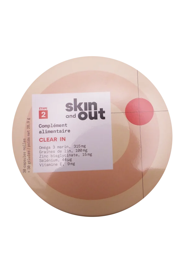 Skin & Out Clear In Étape 2, 30 capsules + 30 gélules, est un complément alimentaire du programme In & Out contre l’acné adulte, ciblant l’inflammation et les mécanismes profonds des boutons. Composé de 1 capsule molle oméga-3 marins (EPA/DHA) et 1 gélule végétale (graines de lin, zinc, sélénium, vitamine E), il soulage l’inflammation, régule le sébum et accélère la cicatrisation cutanée en 1 mois.