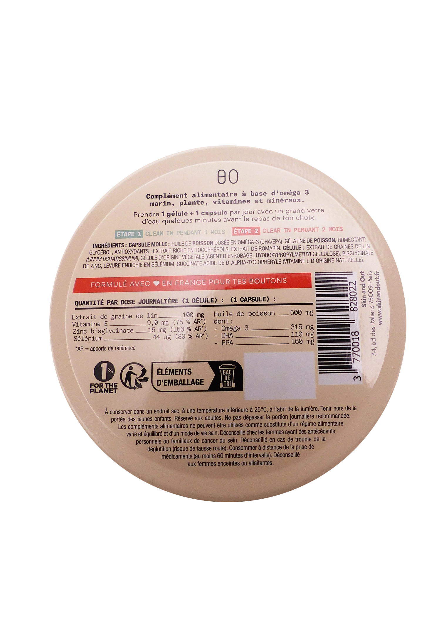 Clear In Étape 2 agit après Clean In (détox foie/microbiote) pour traiter spécifiquement l’inflammation bouton : oméga-3 anti-inflammatoires, lignanes de lin anti-aromatases (équilibre hormonal/sébum), zinc purifiant hautement assimilable, sélénium cicatrisant et vitamine E antioxydante naturelle. Cure 1 mois (matin), boîte recyclable, non vegan (gélatine poisson).