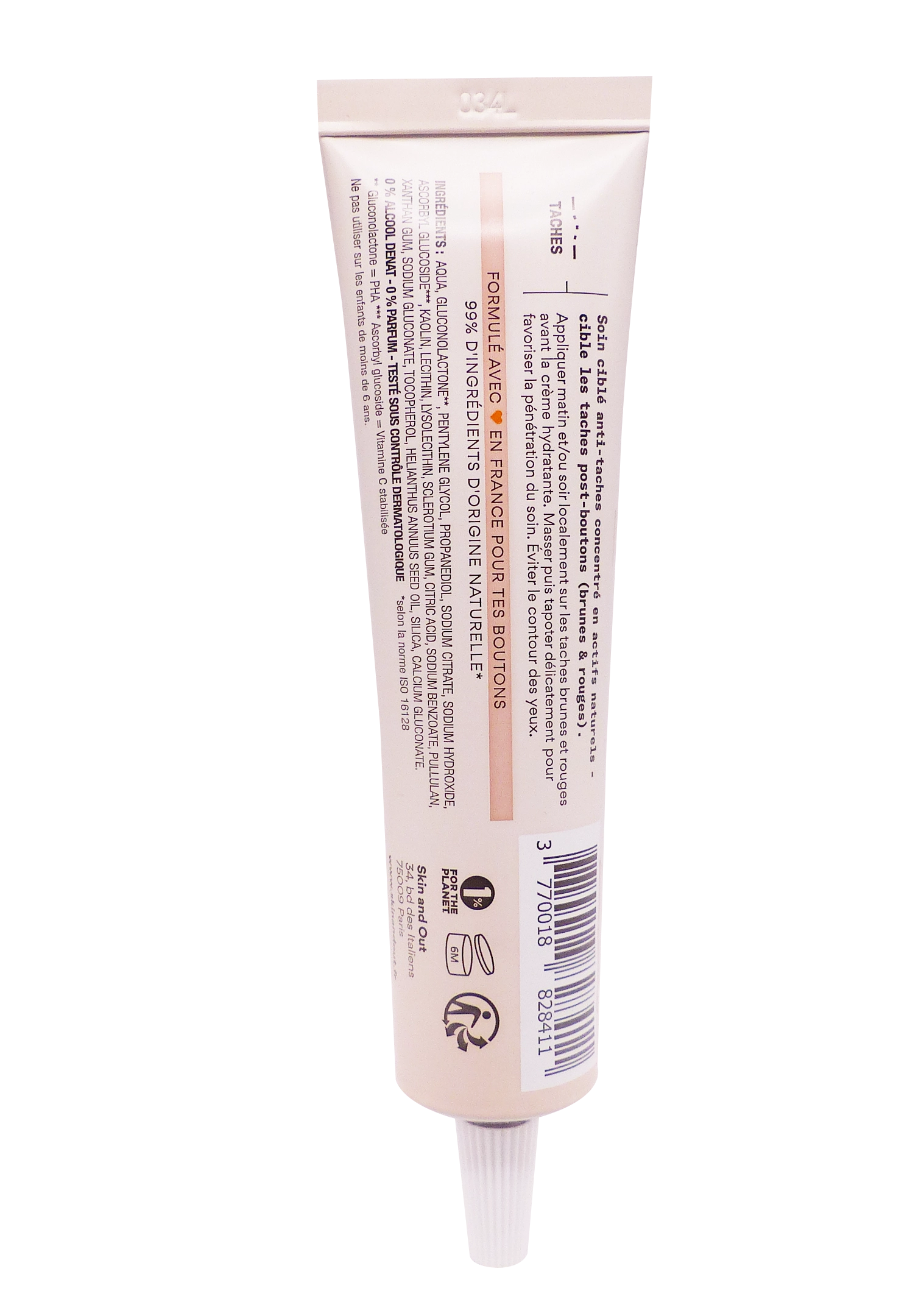 Ce soin ciblé Skin & Out traite les cicatrices pigmentaires laissées par les boutons (taches brunes, rougeurs en relief), avec une action rapide mais douce respectant la barrière cutanée. Texture fluide non grasse, pH 4,8-5,2, il convient aux peaux acnéiques, matures ou exposées au soleil. Tube airless de 30 ml (2 mois), 99% naturel, made in France.