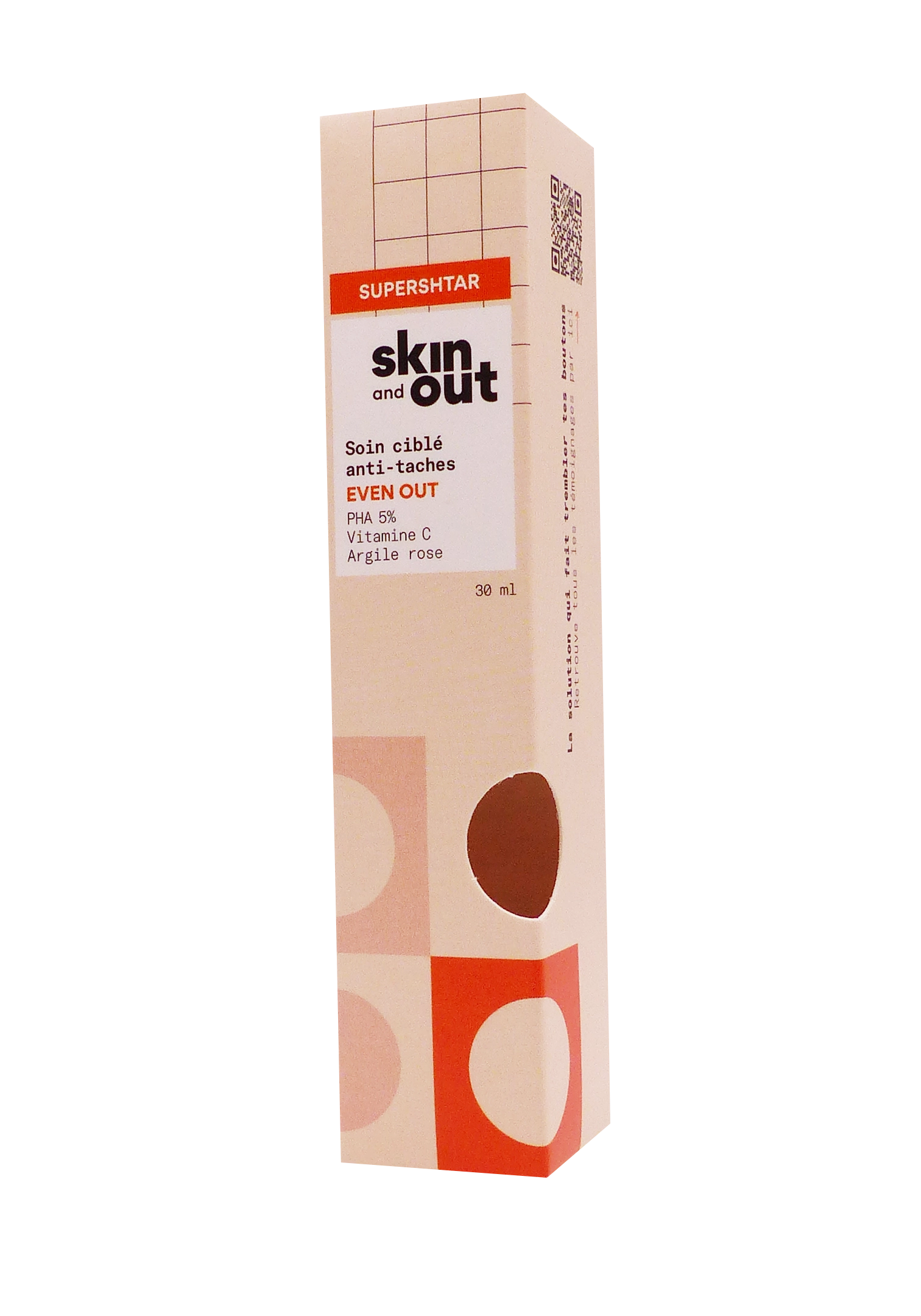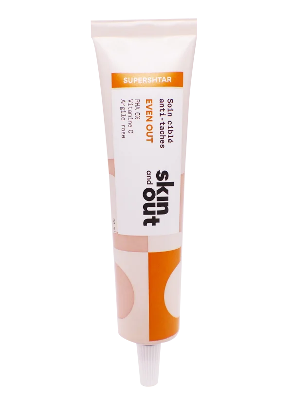 Skin & Out Even Out Soin Ciblé Anti-Taches 30 ml est un sérum concentré conçu pour atténuer les taches brunes et rouges post-acné sur toutes peaux, même sensibles. Sa formule clean🌿 agit sur la formation des marques pigmentaires grâce à une vitamine C micro-encapsulée, des PHA exfoliants doux (5%) et de l’argile rose apaisante, pour un teint unifié sans irritation.