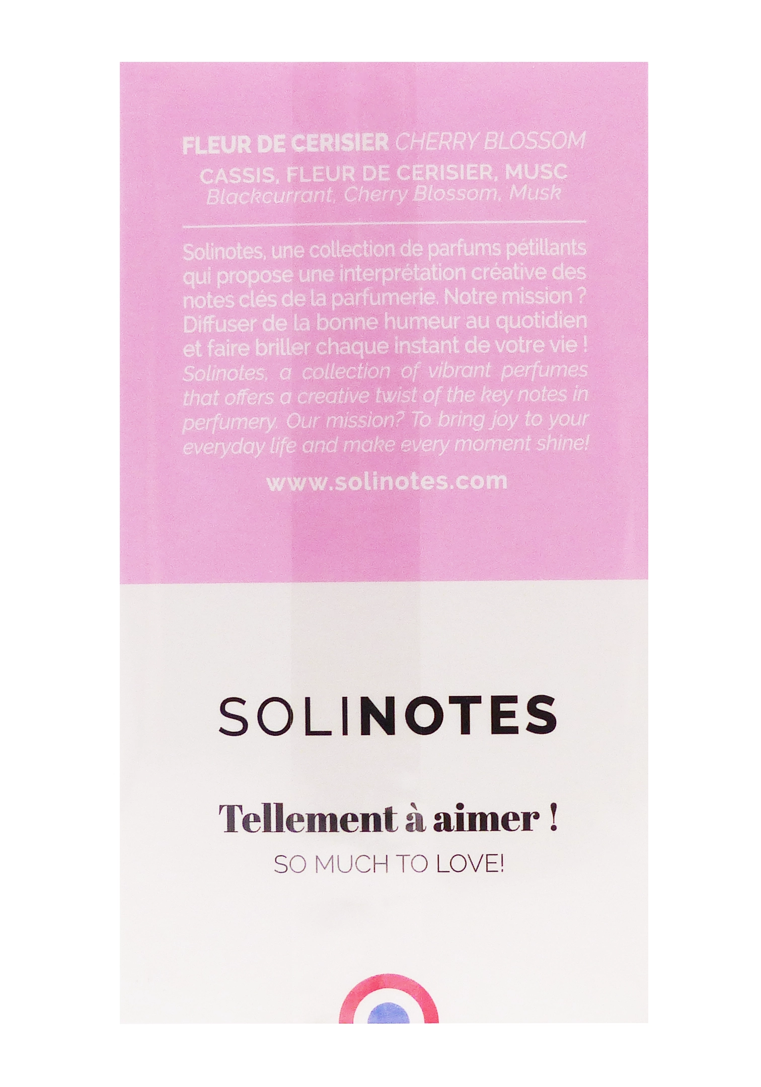 Les notes de tête révèlent un accord frais de cardamome, citron et mandarine, qui apportent une touche d’énergie et de vitalité. Le cœur floral, composé de cassis, cerise, framboise et rose, dévoile une douceur gourmande et délicate, tandis que les notes de fond, avec la pomme et le musc, prolongent la sensation de bien-être et de sérénité. Ce parfum convient aussi bien aux amateurs de senteurs florales qu’aux adeptes de fragrances fruitées et gourmandes, et peut être porté seul ou associé à d’autres parfums Solinotes pour créer un sillage unique et personnalisé.