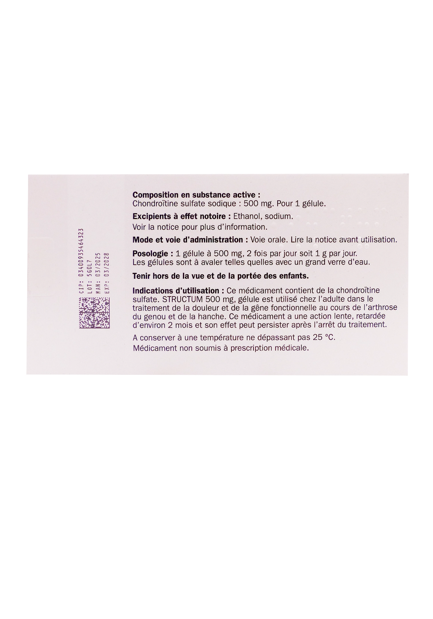 Structum 500 mg est un médicament du laboratoire Pierre Fabre à base de sulfate de chondroïtine, et utilisé pour traiter les douleurs liées à l’arthrose chez l’adulte et l’adolescent de plus de 15 ans.