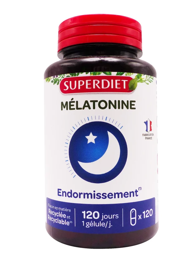 Superdiet Mélatonine 120 gélules est un complément alimentaire contenant 1 mg de mélatonine pure par gélule, hormone naturelle qui régule le cycle veille-sommeil et aide à réduire le temps d’endormissement ainsi qu’à atténuer les effets du décalage horaire.