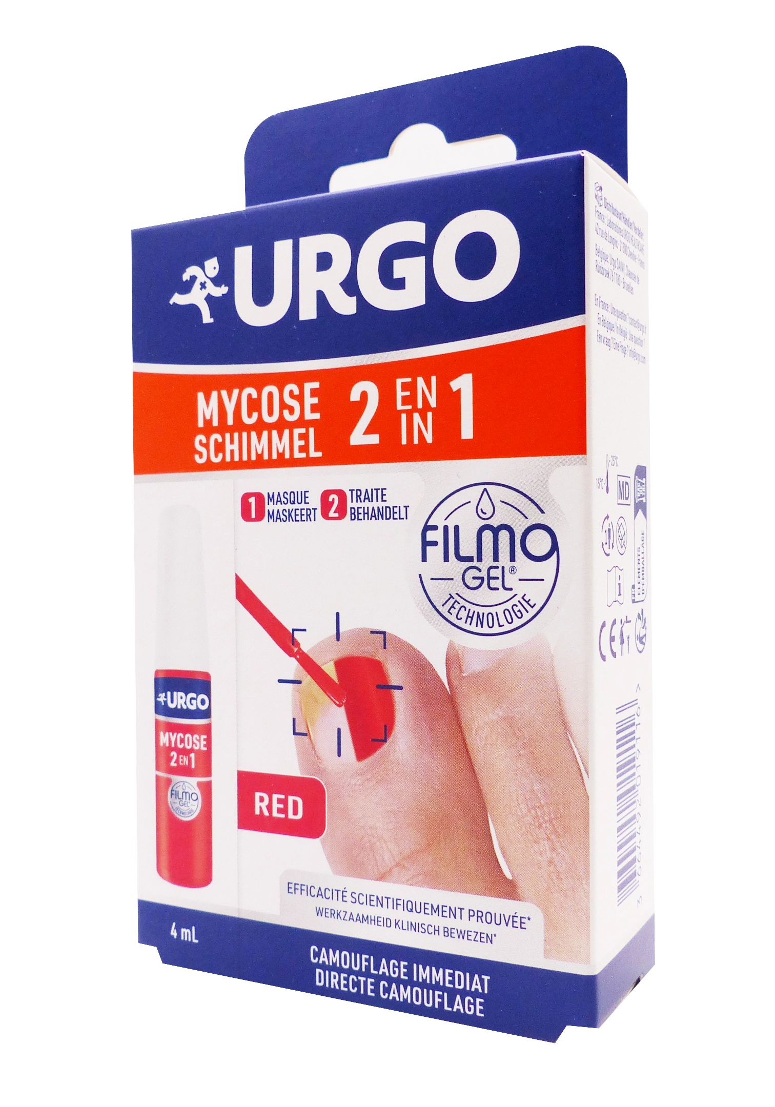 Urgo Filmogel Mycose 2 en 1 vernis Rouge4 ml est un dispositif médical innovant conçu pour traiter les mycoses de l’ongle tout en améliorant immédiatement son apparence. Grâce à la technologie Filmogel, il forme un film invisible et protecteur qui agit sur l’ongle infecté tout en le camouflant avec une jolie teinte rouge corail. Il permet ainsi de poursuivre le traitement antifongique sans renoncer à l’esthétique, avec une tenue pouvant aller jusqu’à 72 heures.